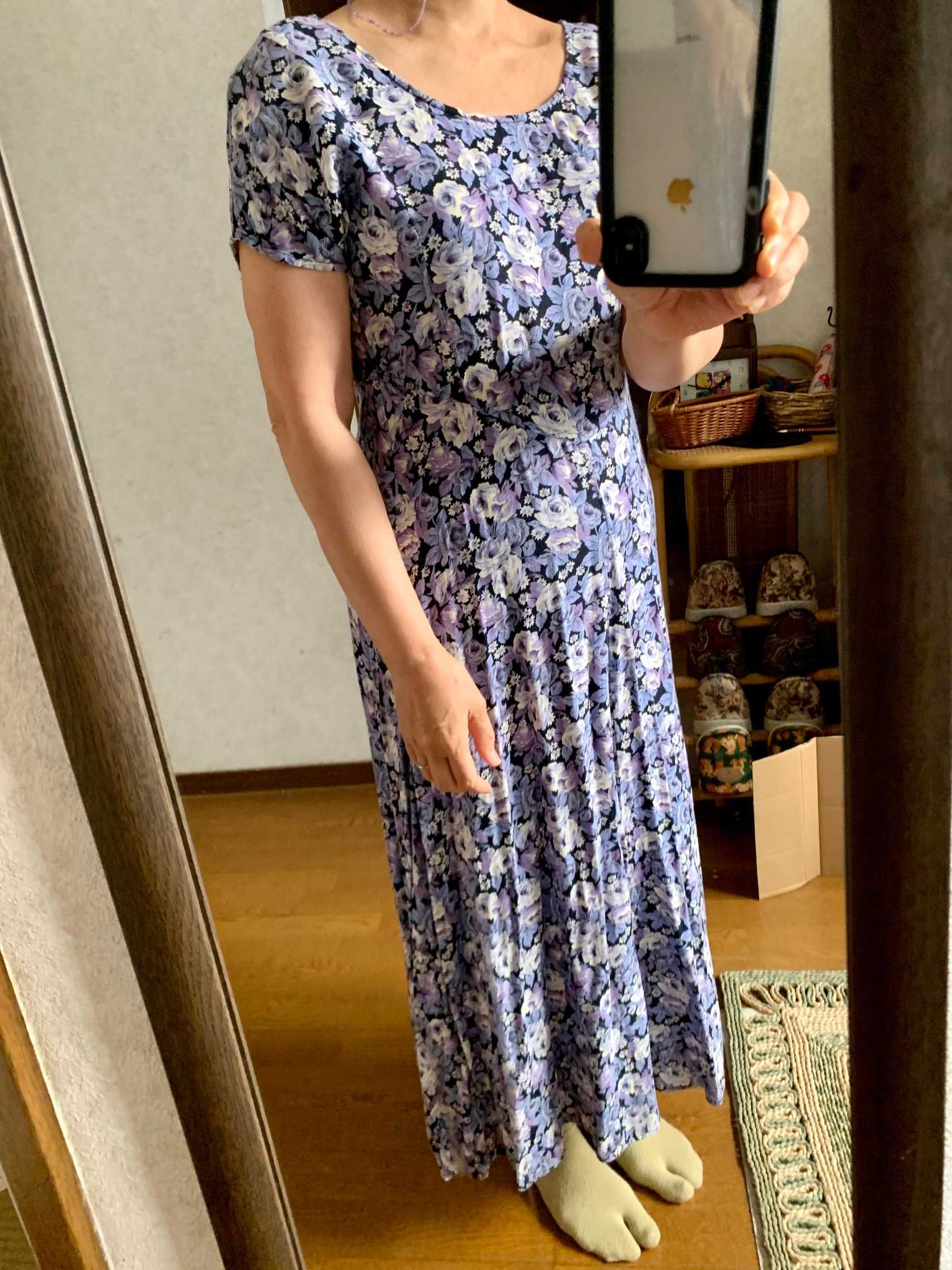ダイエット食事日記5643日、息子と映画「流浪の月」、ランチ、ぶんぐまる、スーパー青・紺・紫の花柄ワンピース、ベージュの靴下、黒のクロスゴム靴。