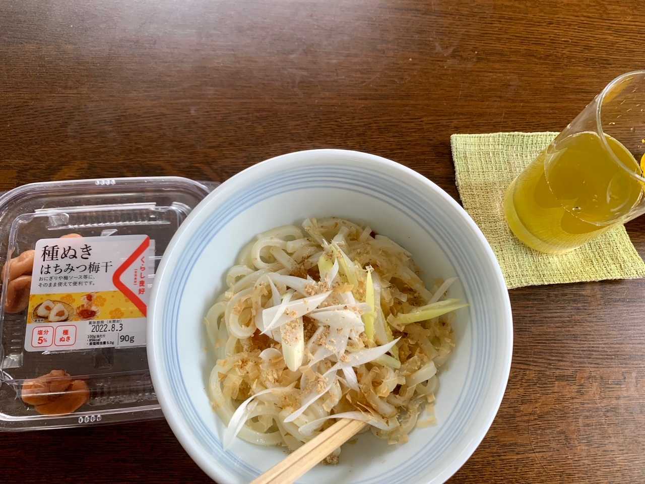 卓球の練習に行きました。蒸し暑くて、疲れましたね。昼食は、冷やしおろしうどん・ネギ、梅干し、緑茶。