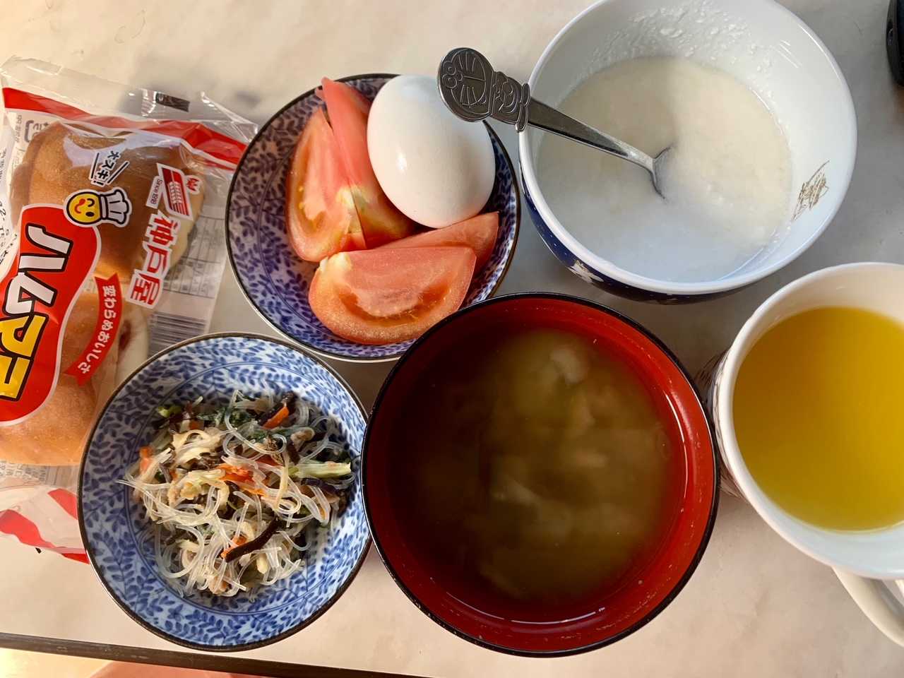 朝食は、ハムマヨパン、トマト、ゆで卵、和風春雨サラダ、カスピ海ヨーグルト、茄子の味噌汁。オレンジジュース。