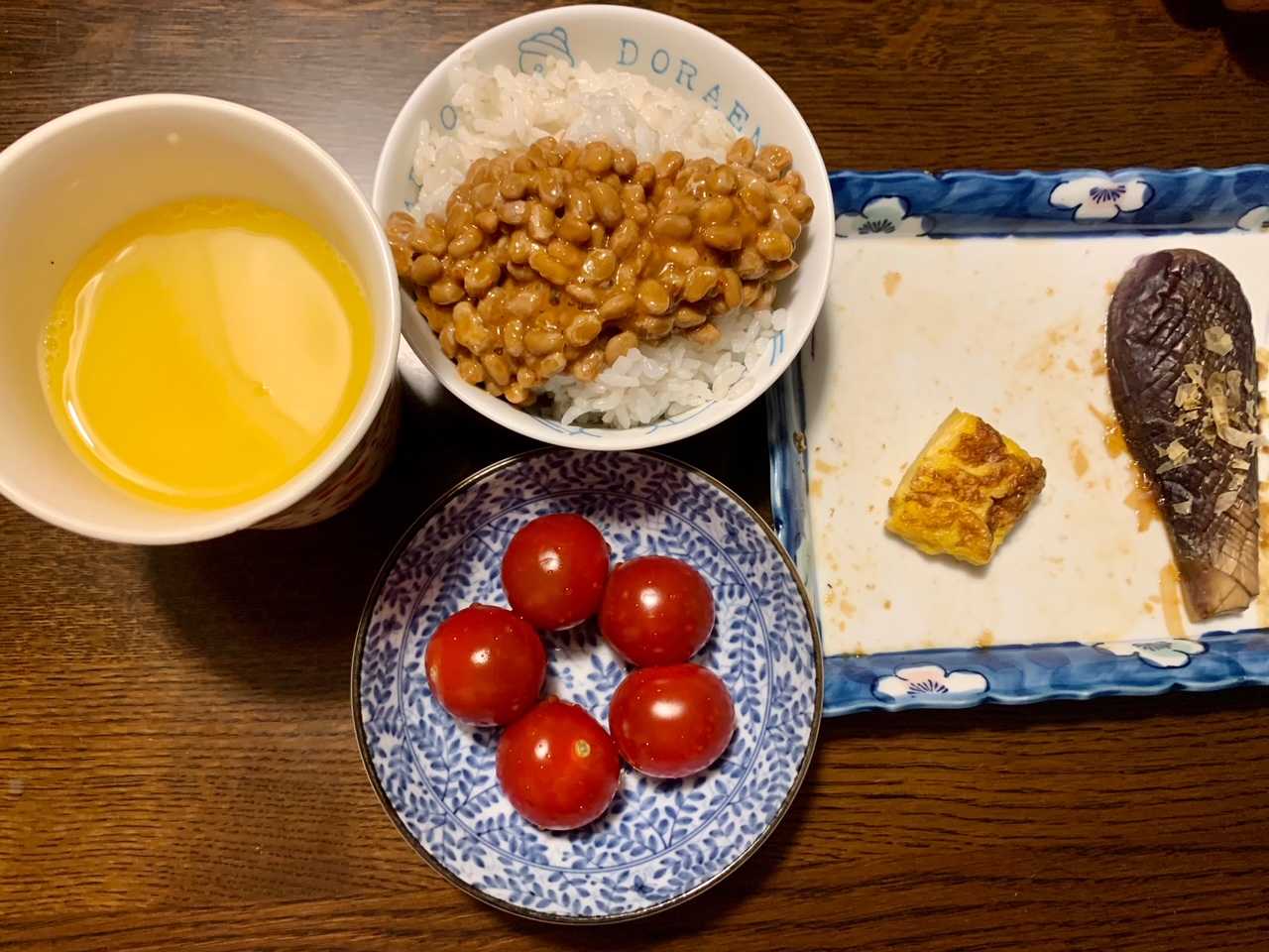 朝食は、納豆・キムチだれ・麦ご飯、卵焼き、蒸し茄子、オレンジジュース。カスピ海ヨーグルト。ぶどう。