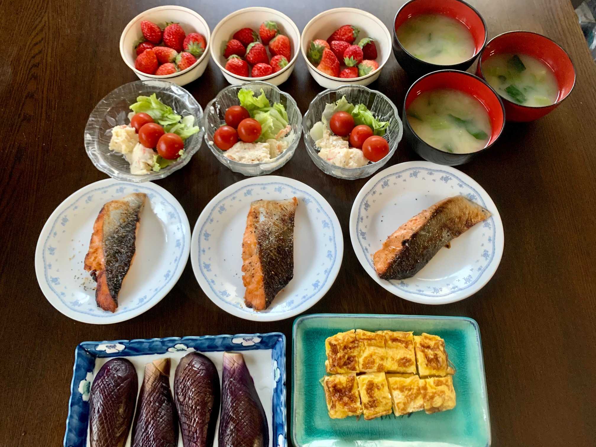 夕食は、鮭のコンソメ焼き、蒸し茄子、卵焼き、ポテトサラダ・レタス・ミニトマト、青梗菜の味噌汁、いちご・とちおとめ。体重は、夕食後・入浴前57.8kg。2日前より1.1㎏増えた・・・体脂肪率は、33.8%。入浴後、57.6kg。31.9%。