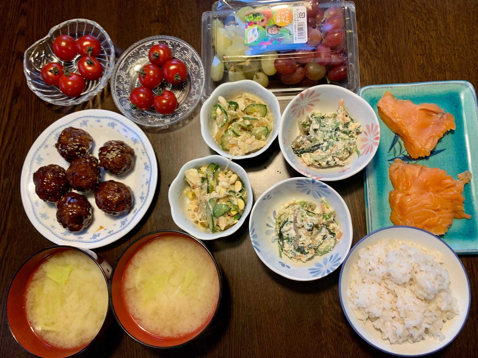 夕食は、肉団子、スモークサーモン、ミニトマト、鶏・中華クラゲ・もやし・胡瓜、ほうれん草の白和え、キャベツの味噌汁、種無しぶどうミックス。
