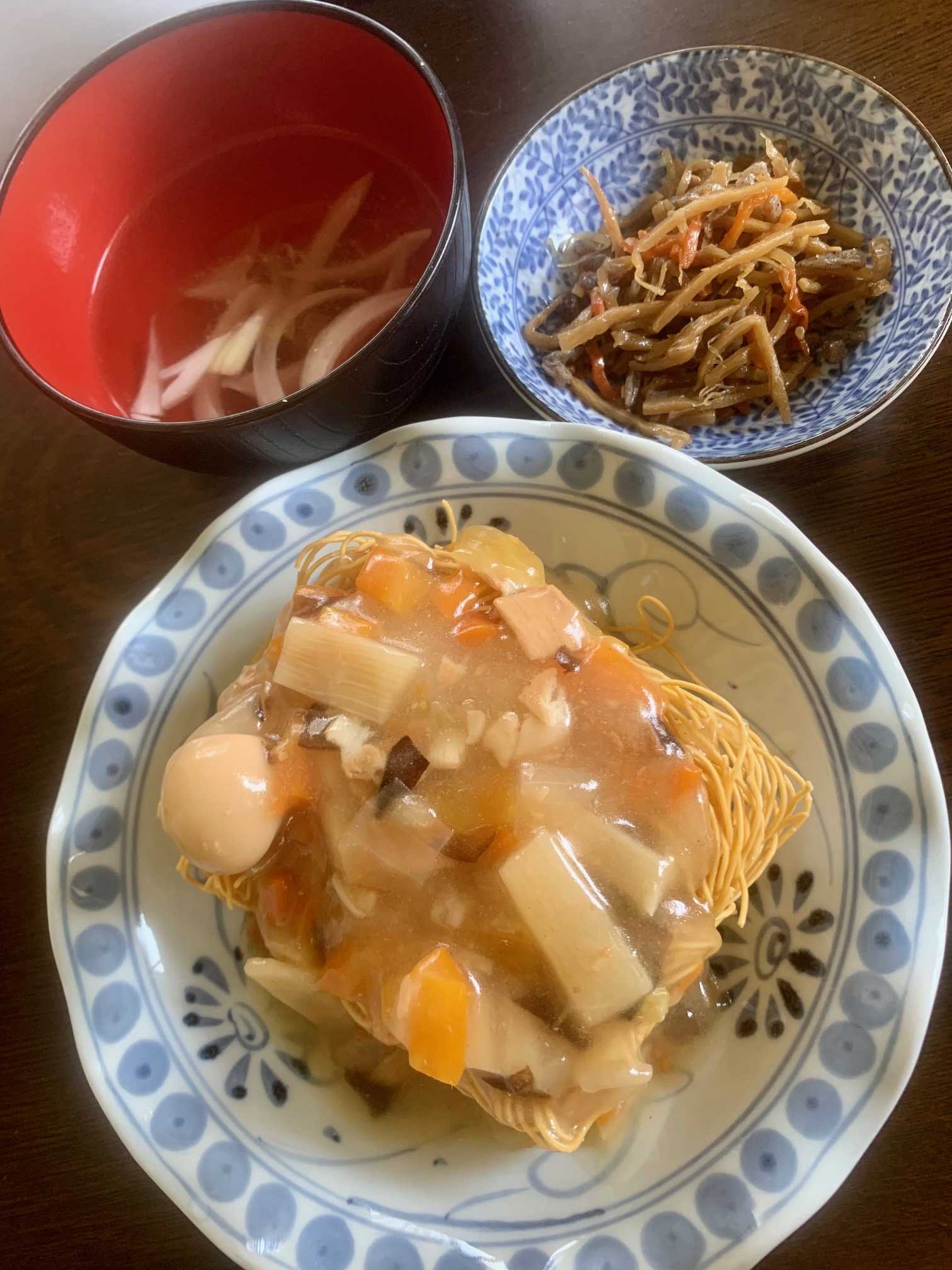 昼食は、あんかけかた焼きそば、きんぴらごぼう、玉ねぎのコンソメスープ。