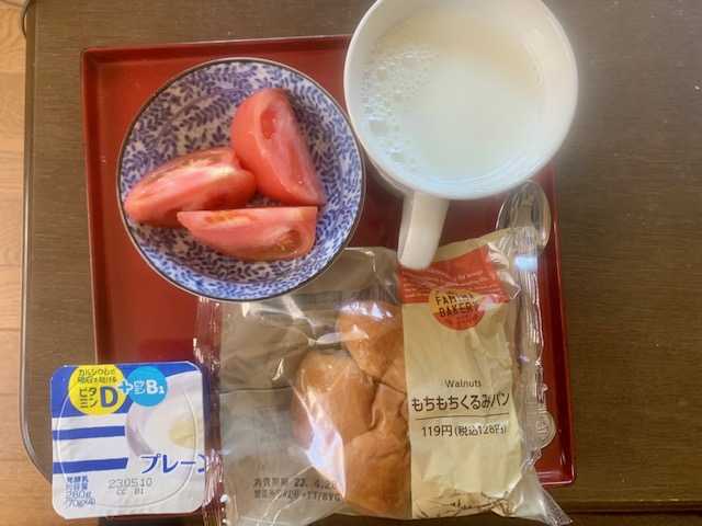 朝食は、もちもちくるみパン、トマト、ヨーグルト、牛乳。