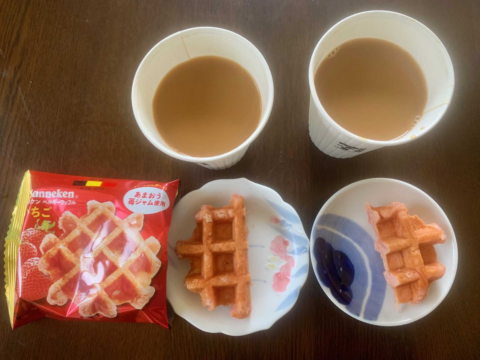 おやつは、マネケン・ベルギーワッフル・いちご、コーヒー。夫は少ない方がいいと言うので、右のワッフルを。