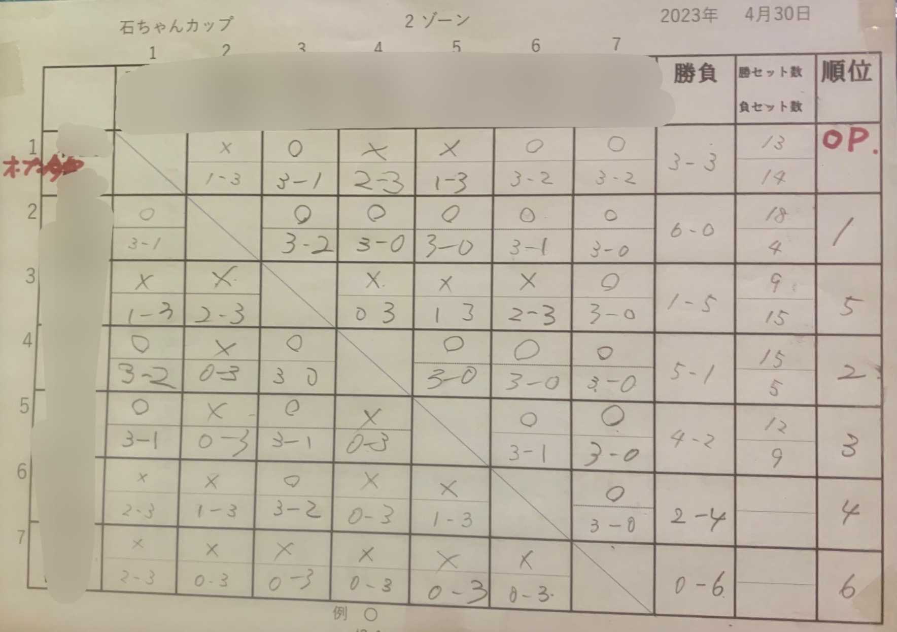 石ちゃんミックスダブルス(青梅)にKさんと参加。4台中2番目の台。2勝4敗で6ペア中4位。主催者ペア4位だが順位に入らず、入れた7ペアだと5位になる。1-3M・Mペア 裏裏男性はツッツキに最初ネットしてたが、後はドライブで撃ち抜いてきた。女性もドライブが強い。横下サーブには2回くらい引っかかったが、後は打ってきた。3-2T・Oペア 粒裏 表裏錦糸町で隣の台だったOさん。私を覚えていてくれた。Tさんが横下サーブをネット。Oさんも今日はあまりドライブが決まらずオーバー。キョウヒョウはスマッシュ出来るとSさんに聞いた。少し試してみたけど割と入る。Kさんの上サーブのレシーブを打てた。横サーブのレシーブがバックに来るのに注意。0-3H・Hペア 表裏、裏裏割と競ってたけど負けた。Hさんには横下サーブ効いた。Kさんの上に構える横サーブのレシーブがバックに来るのに対応出来なかった。2人とも若くて打ってくる。Hさんのバックサーブは下切れと横下がある。よく切れてる。1-3K・Mペア 裏裏ミングルスのシングルスでフルゲームで負けたMさんと再会。リベンジしたかったがまた負けてしまった。Kさんがドライブで打ってくるがミスも割とある。Kさんの下切れサーブが切れてる。Mさんもドライブがすごい。横下サーブが割と効いた。Kさんの上サーブのレシーブを打ち損じた。ネットにかかる。2-3I・Iペア 裏裏主催者ペア。フルゲームで3ゲームジュースで負けた。横下サーブや横上サーブは割と効いたが、横下サーブのレシーブをKさんは取り辛いらしい。私もKさんの横上サーブのレシーブを打ち損じた。コーナーは割と決まった。5ゲームジュース惜しかった。3-0O・Sペア 裏 アタック8横下・横上サーブが効いた。Kさんのサーブも効いていた。Oさんのフォアドライブが曲がってくる。昼食・おやつはコンビニで買ってきたものと、差し入れ。