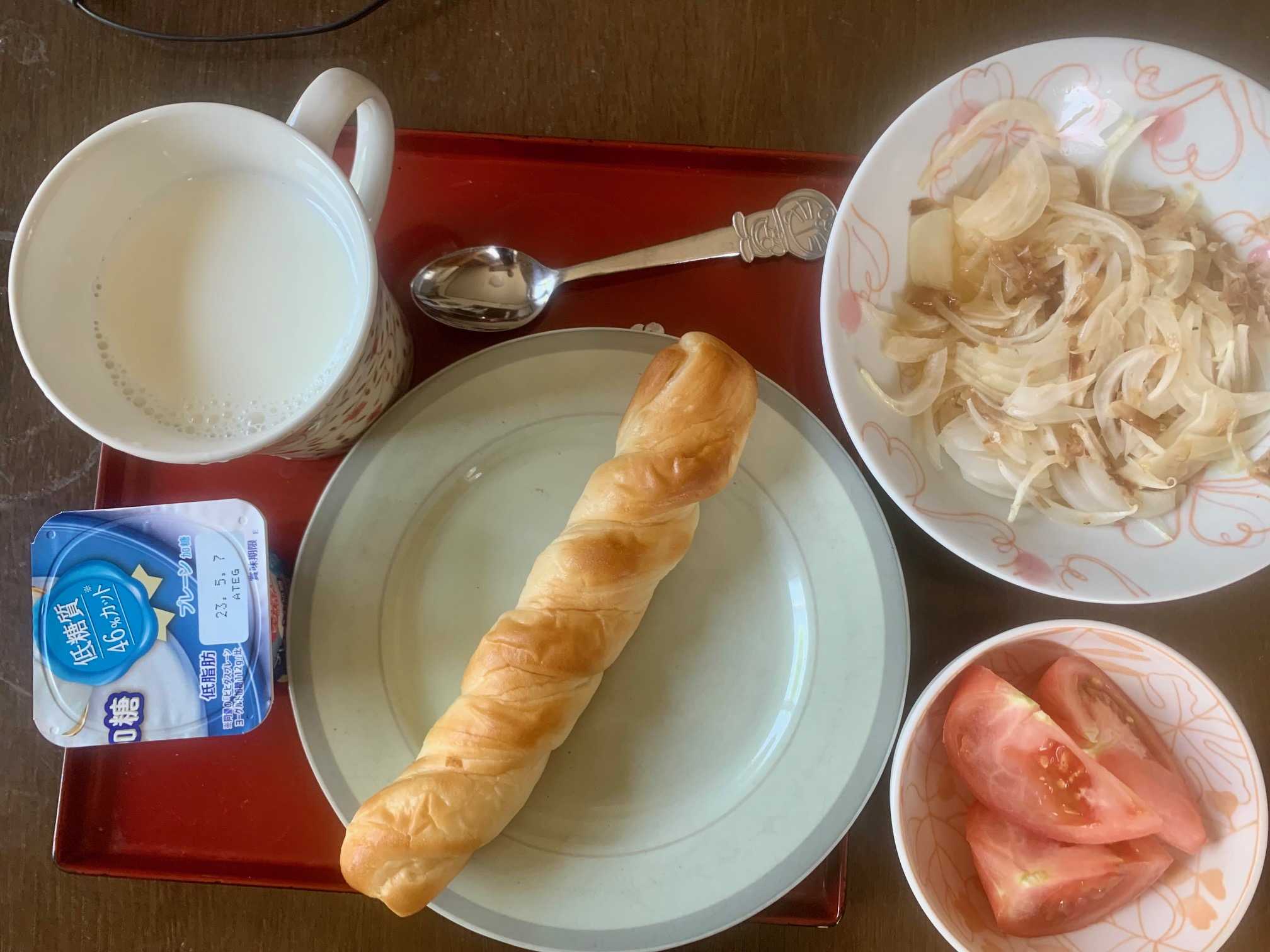 朝食は、ミルクツイストパン、新玉ねぎ・鰹節のポン酢和え、トマト、ヨーグルト、牛乳。