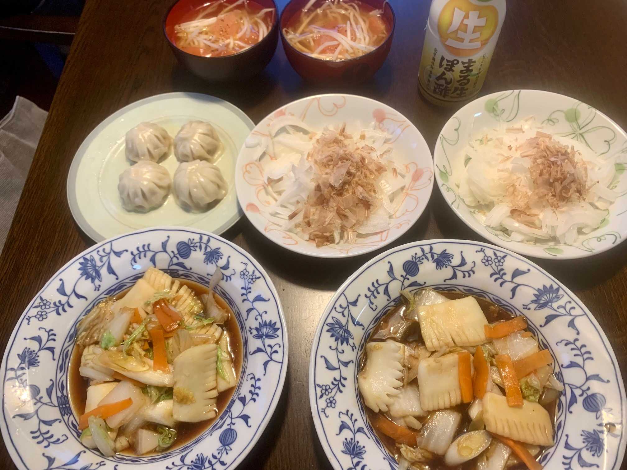 夕食は、烏賊・白菜・人参のオイスターソース炒め、小籠包、新玉ねぎ・鰹節のポン酢和え、トマト・もやしの中華スープ。体重は、夕食後・入浴前58.2kg。4日前から0.2kg増えた。体脂肪率は、35.7%。入浴後、58kg。32.8%。