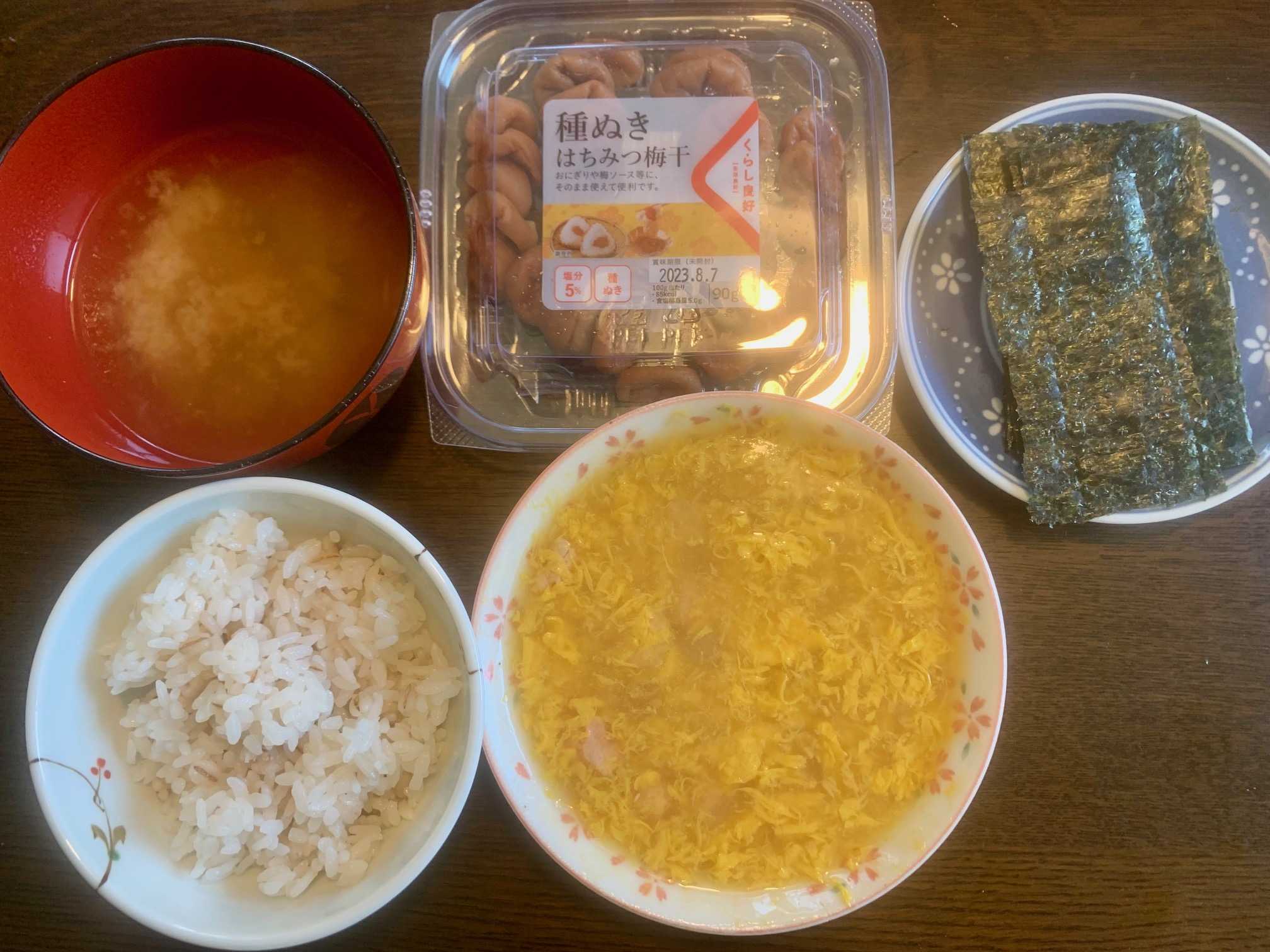 昼食は、親子丼、梅干し、海苔、味噌汁。