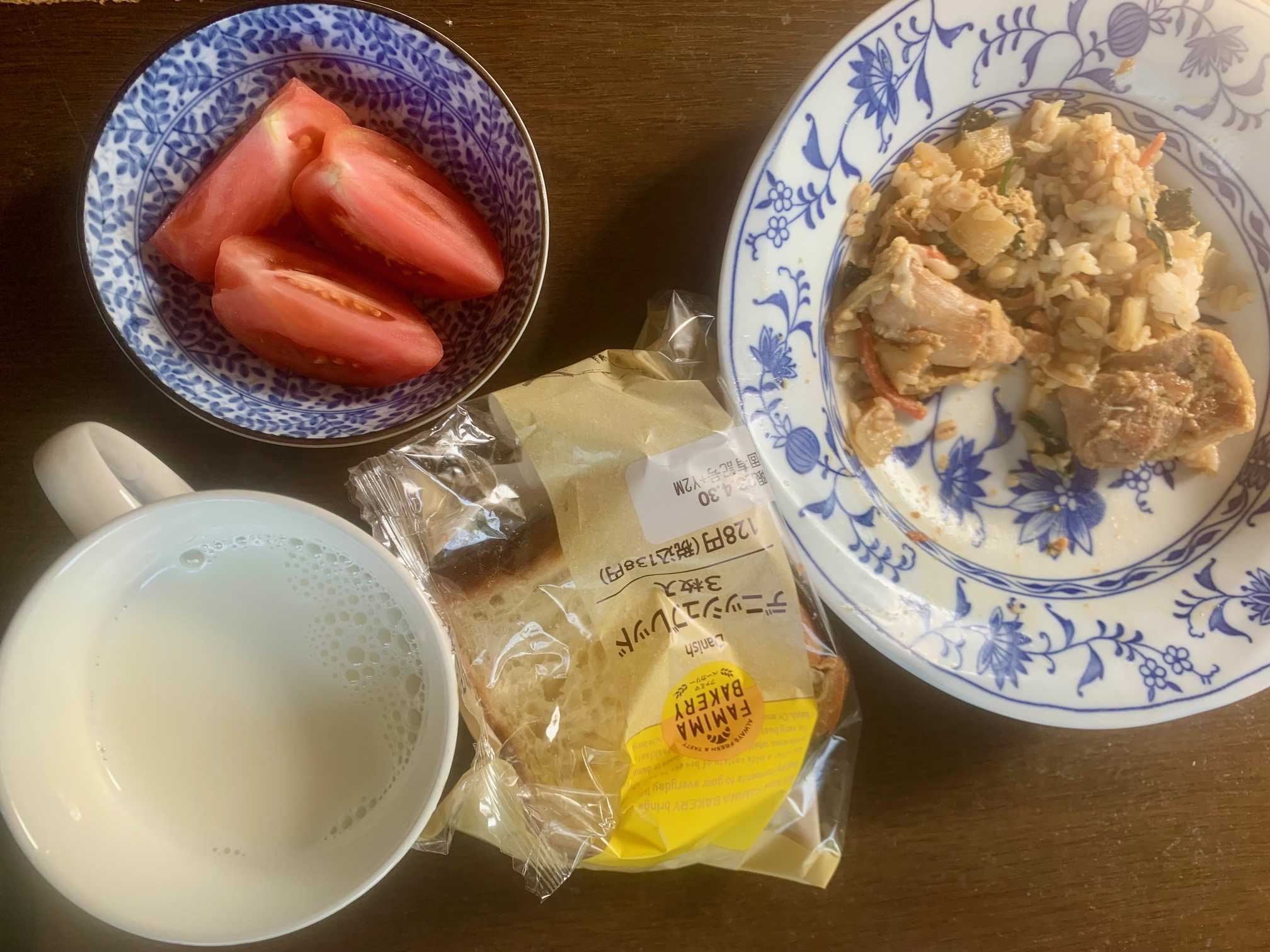 朝食は、韓国焼き飯・チーズポックンパ、トマト、デニッシュブレッド、牛乳。