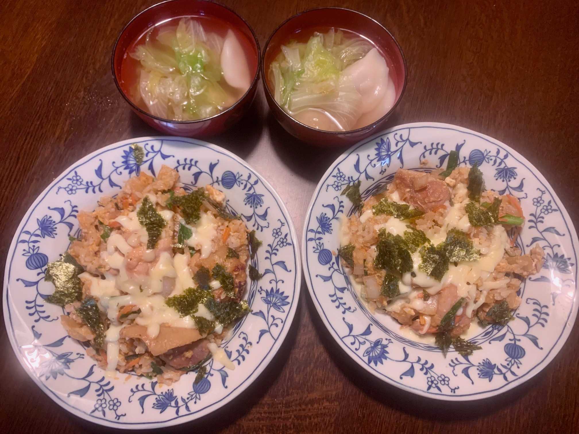 夕食は、韓国焼き飯チーズポックンパ風。水餃子・レタスのスープ。韓国風焼飯/チーズポックンパ