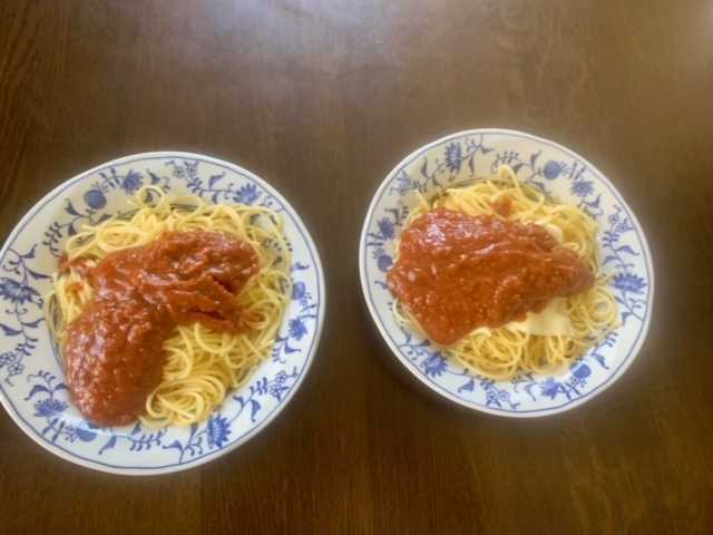 昼食は、ミートソーススパゲティ・チーズ、ジャスミンティー。