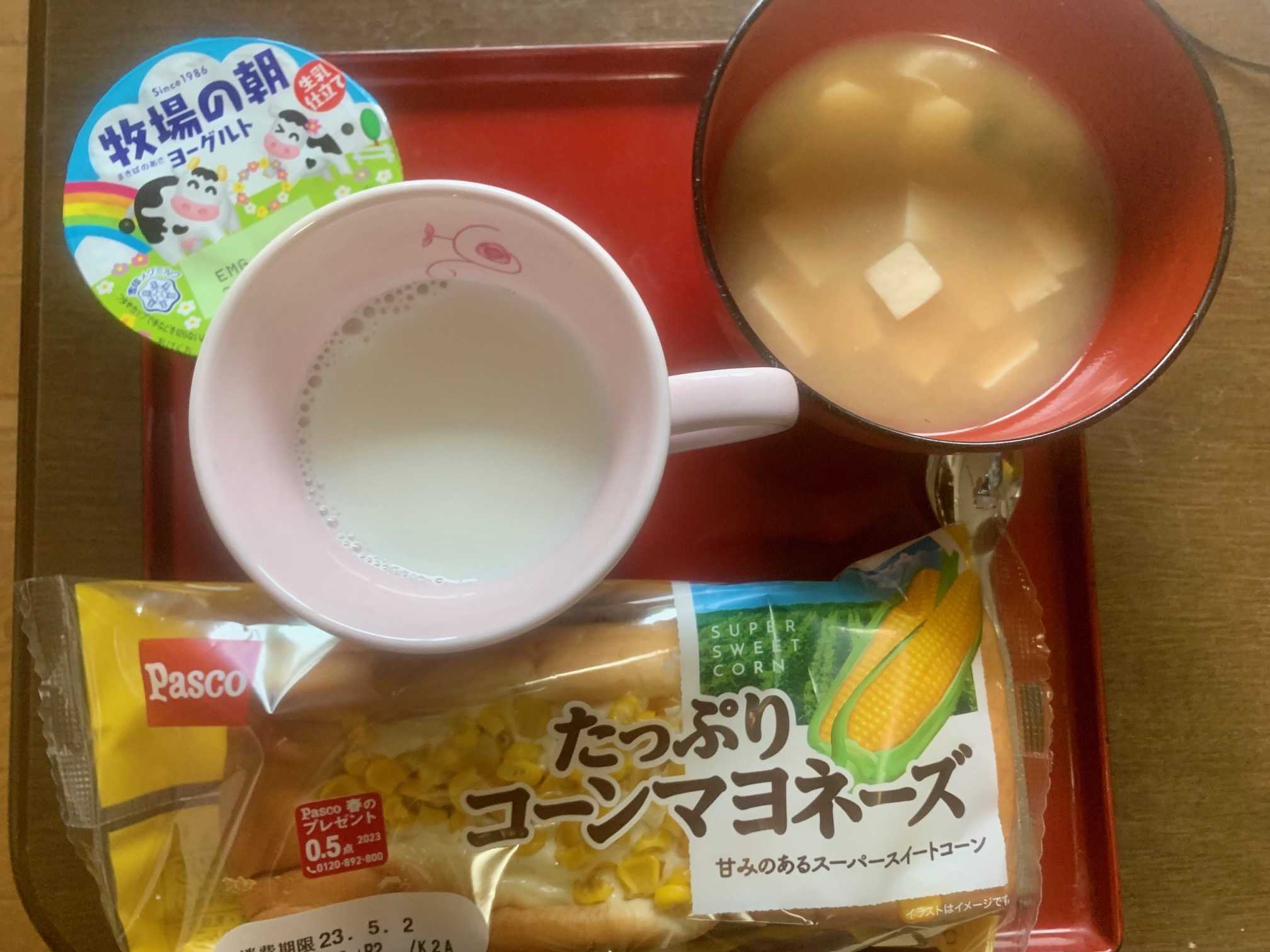 朝食は、たっぷりコーンマヨネーズパン、ヨーグルト、豆腐・ネギの味噌汁、牛乳。