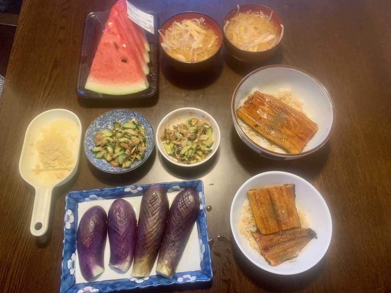 夕食は、鰻の蒲焼丼、茗荷・胡瓜・茄子の味噌和え、蒸し茄子・生姜・ポン酢、油揚げ・もやしの味噌汁、西瓜。