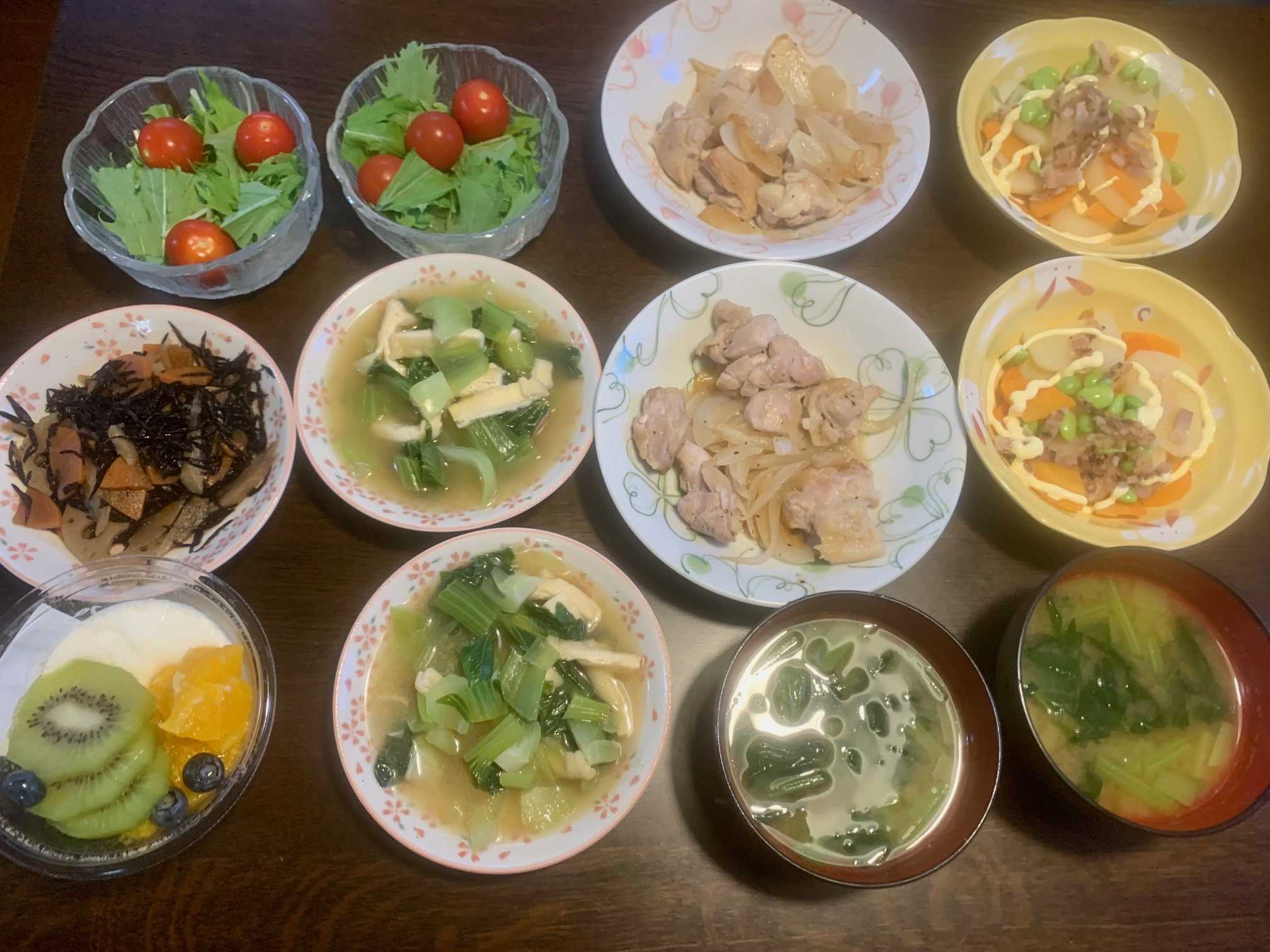 夕食は、鶏・玉ねぎ炒め、油揚げ・青梗菜の煮浸し、ひじき・蓮根・人参・牛蒡煮、カリカリベーコン・じゃがいも・人参・枝豆サラダ、水菜・ミニトマト、茄子の糠漬け、小松菜の味噌汁、キウイ・オレンジ・ブルーベリー・杏仁豆腐。