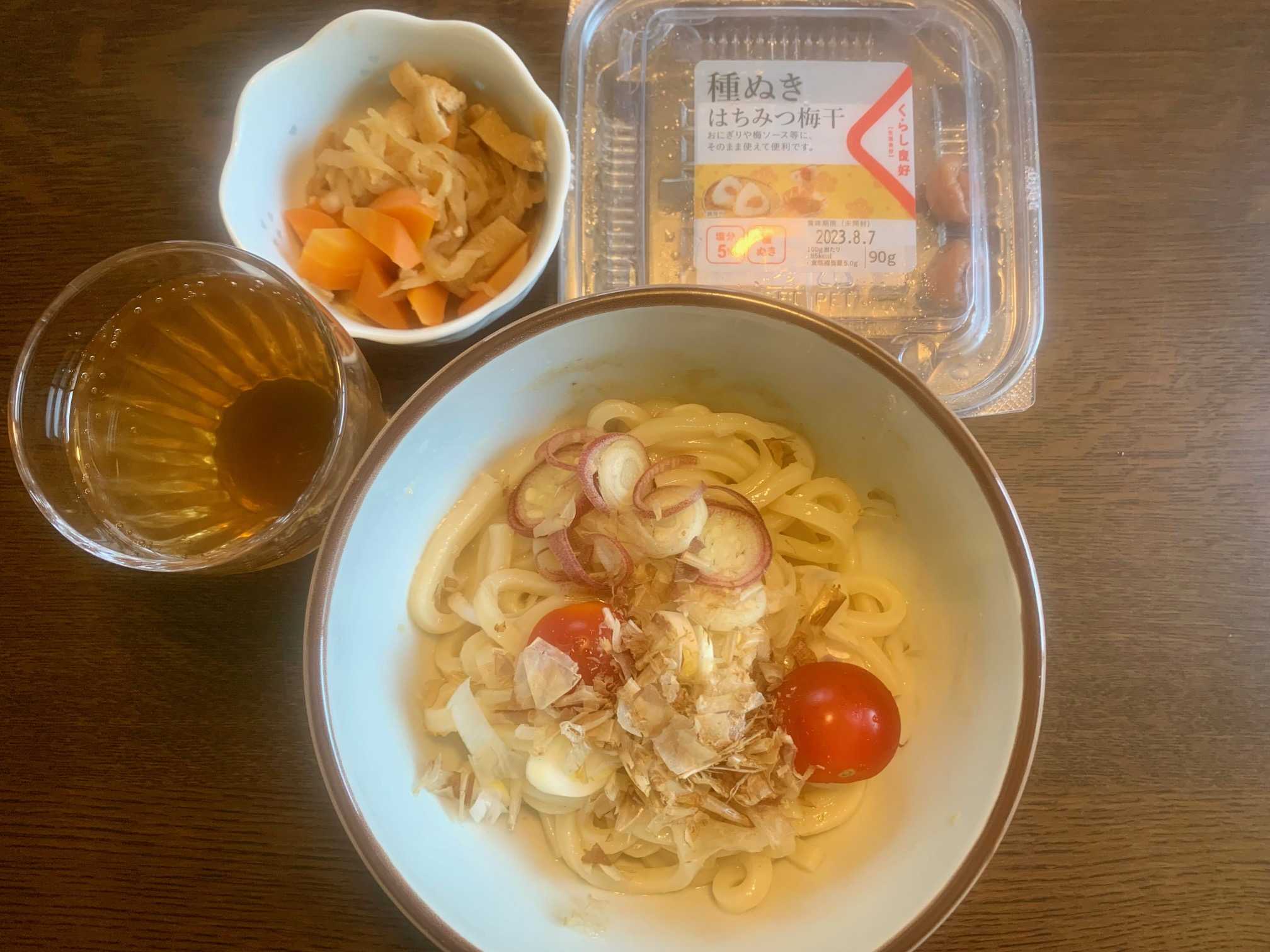 昼食は、とろろ・茗荷・ミニトマト・鰹節・うどん、梅干し、油揚げ・切り干し大根・人参煮、麦茶。