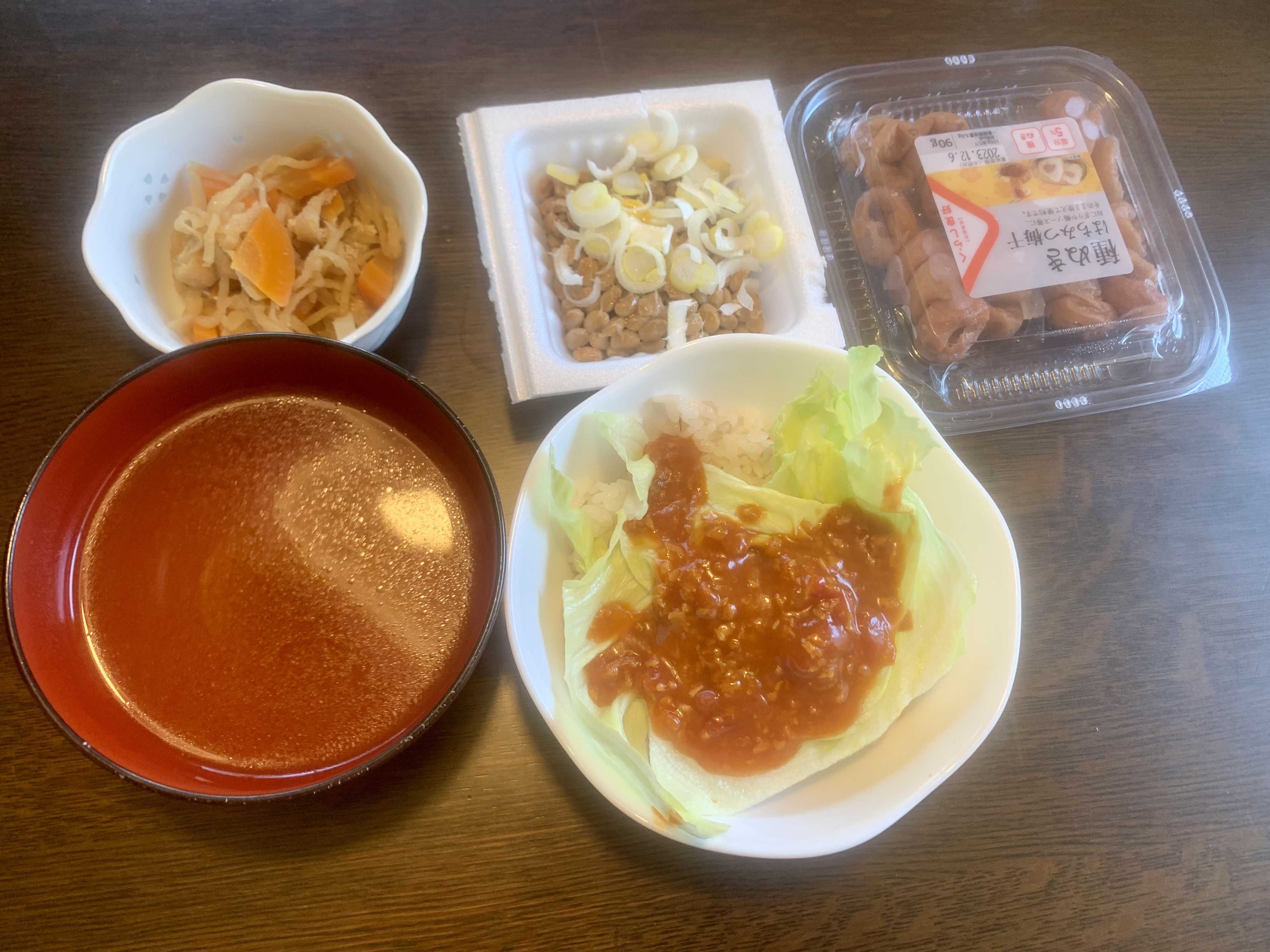 卓球の練習に行きました。帰ってシャワー。体重は、シャワー後・昼食前57.6kg。体脂肪率は33.4%。昼食は、タコライス・レタス、納豆・ネギ、油揚げ・人参・切り干し大根煮、梅干し、コンソメスープ。