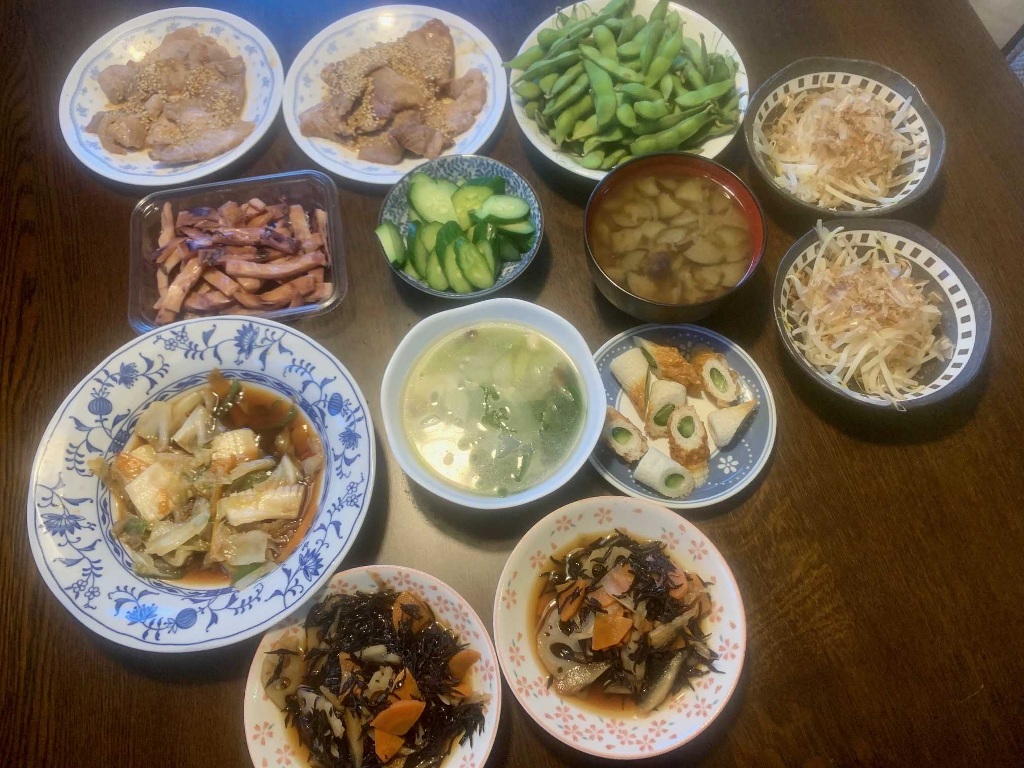 夕食は、十勝の豚丼、枝豆、烏賊・ピーマン・人参・キャベツ炒め、鶏・青梗菜・しめじの白湯スープ、イカ焼き、胡瓜の糠漬け、竹輪・胡瓜、もやし・鰹節・ポン酢、ひじき・蓮根・人参・牛蒡煮、茄子の味噌汁。