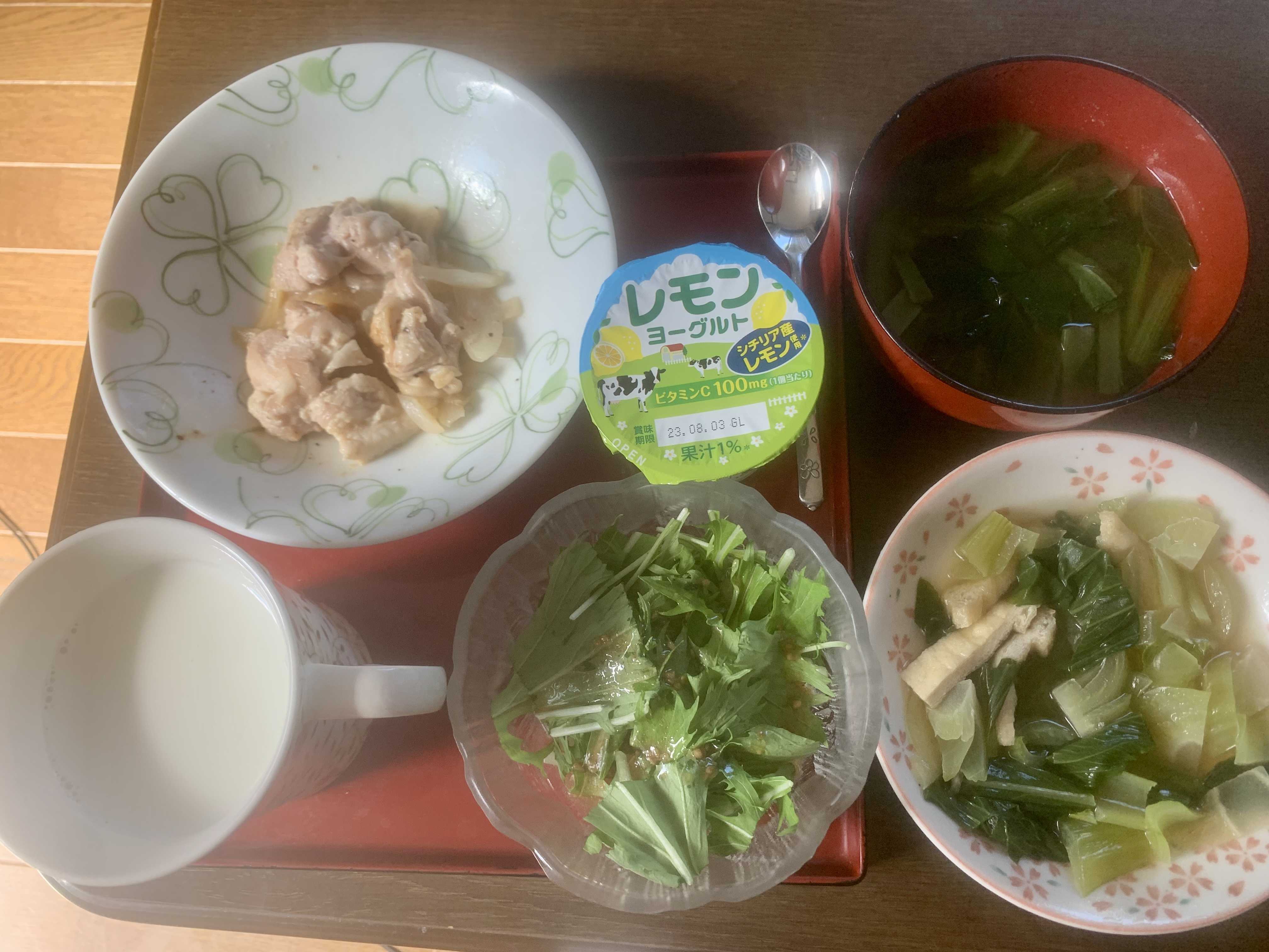 朝食は、鶏・玉ねぎ炒め、油揚げ・青梗菜の煮浸し、水菜、小松菜の味噌汁、レモンヨーグルト、牛乳。