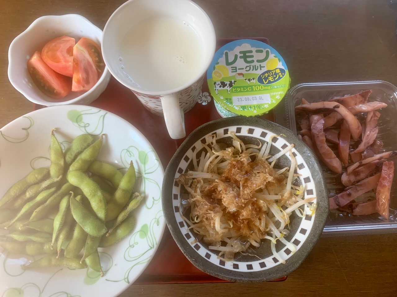 朝食は、焼きイカ、枝豆、もやしのおかか和え、トマト、レモンヨーグルト、牛乳。