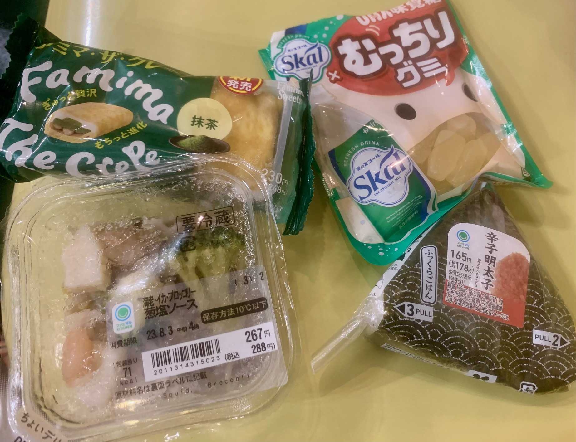 昼食は、行きがけにファミリーマートで買ったもの。辛子明太子おにぎり、海老・イカ・ブロッコリー・葱塩ソース、抹茶クレープ、むっちりグミ・スコール。Bさんから、ダブルシュークリームをいただきました。