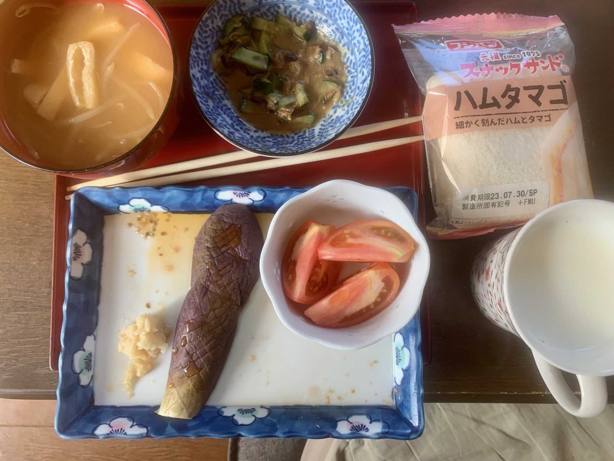 朝食は、スナックサンド・ハムタマゴ、トマト、茗荷・胡瓜・茄子の味噌和え、蒸し茄子・生姜・ポン酢、油揚げ・もやしの味噌汁、牛乳。