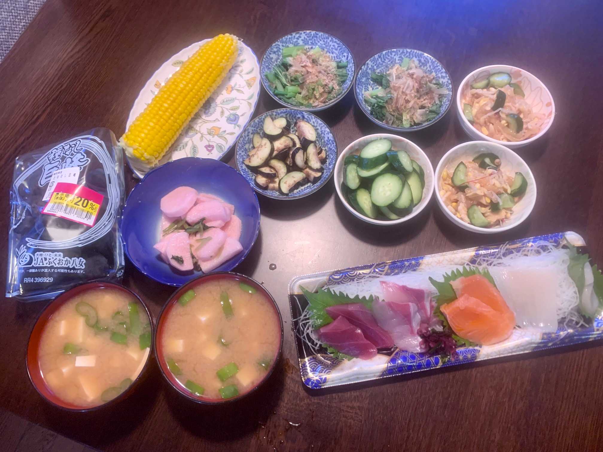 夕食は、刺身(まぐろ・はまち・サーモン・烏賊・帆立)、山芋の梅酢漬け、鶏・中華クラゲ・豆もやし・胡瓜・糸とうがらし、胡瓜・茄子の糠漬け、小松菜のおひたし、蒸しとうもろこし、豆腐・ネギの味噌汁、種無し巨峰。