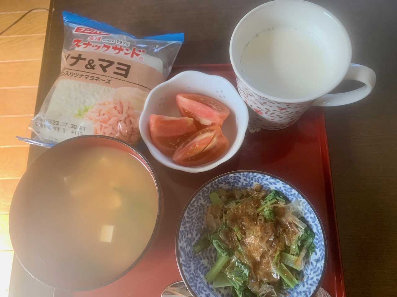 朝食は、スナックサンド・ツナ&マヨ、トマト、小松菜のおひたし、豆腐・ネギの味噌汁、牛乳。