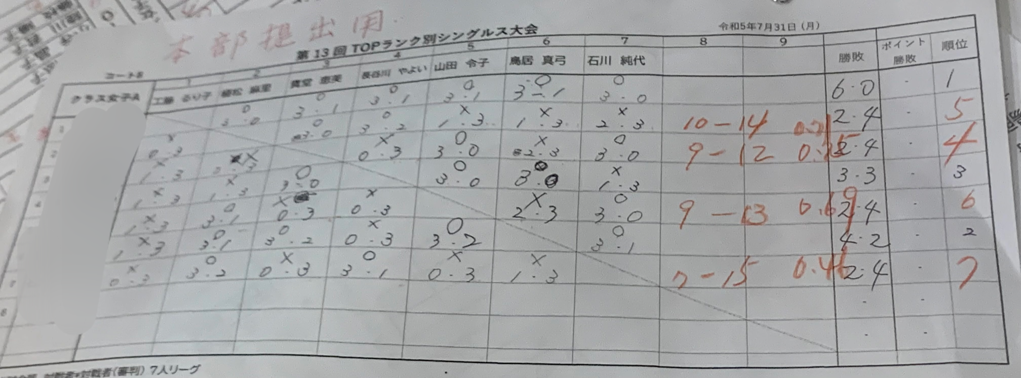 ダイエット食事日記3891日、ファミリーマート、TOPランク別シングルス大会(青梅)、WTTコンテンダーリマ、WTTユースコンテンダーチョンヤン、卓球 FISUワールドユニバーシティゲームズ。青・紫・白・茶のプルオーバー、紺のワイドパンツ、白・青の靴下、青のストレッチシューズ。卓球には、青・ピンク・黄緑・赤・白の花柄卓球ユニフォーム、黒・青のスコート、白・青の靴下、青のストレッチシューズ。朝食は、スナックサンド・ハムタマゴ、トマト、茗荷・胡瓜・茄子の味噌和え、蒸し茄子・生姜・ポン酢、油揚げ・もやしの味噌汁、牛乳。TOPランク別シングルス大会(青梅)に参加しました。女子Aクラス 4勝2敗で2位。1-3 Kさん 裏裏 1位11-83-119-114-11縦上のサーブをなんとか抑えてレシーブした。横下のサーブが少し効いた。3ゲーム惜しかった。フォアに入れるとスマッシュされてしまう。ツッツキで粘る。3-1 Uさん 裏裏 5位11-57-1011-613-11横下サーブや、フォア前のショーサーブのレシーブをバックにロングで返球するのが決まった。以前1-3で負けてたけど、リベンジ出来た。3-2 Kさん 裏ペン 4位11-75-1111-711-1311-8横下サーブの3球目攻撃がなかなか決まらなかった。相手の下切れサーブに時々引っかかった。0-3 Hさん 裏裏 3位4-119-118-11速いロングサーブにやられてしまった。浮くとスマッシュされる。横下サーブは少し効いた。3-2 Yさん 裏裏 6位11-97-119-1111-611-5横下サーブや横上サーブが割と効いた。ロングサーブを打つ返せた。先日の多摩スポで1-3で負けたが、リベンジ出来て良かった。3-1 Iさん 裏裏 7位11-211-610-1212-10横下、横上サーブが効いた。下切りに引っかかってくれる。またフルゲームになるかと思ったが逆転出来た。IさんがHさんに3-1で勝ってくれたので、2位になれました。Hさんが勝ってたら、4勝2敗で相対で負け。勝率でもHさんの勝ちかな。2位の賞品は卓球靴下。この中から選んでいいとのこと。この白・ピンクの靴下にしました。昼食は、行きがけにファミリーマートで買ったもの。辛子明太子おにぎり、海老・イカ・ブロッコリー・葱塩ソース、抹茶クレープ、むっちりグミ・スコール。Bさんから、ダブルシュークリームをいただきました。夕食は、真鱈の生姜醤油掛け、小松菜・コーン、胡瓜の糠漬け、豚・玉ねぎ・キャベツ・人参煮、茄子の味噌汁、梨。重は、夕食後・入浴前57.7kg。4日前から0.8kg減った!体脂肪率は、32.7%。入浴後、57.6kg。31.5%。WTTコンテンダーリマ。伊藤、平野らが本戦から出場 カルデラノらトップランカーも参戦<WTTコンテンダーリマ2023見どころ>【WTTコンテンダー リマ2023結果速報】試合予定・トーナメント表・アーカイブ動画情報あり男子シングルス【予選1回戦】松島輝空WR150 VS Rodrigo HIDALGO(ペルー)WR364男子ダブルス【予選2回戦】〇 VS 及川瑞基/松島輝空男子シングルス 及川瑞基(木下グループ)WR64松島輝空(木下アカデミー)WR150 ※予選から女子シングルス 伊藤美誠(スターツ)WR7木原 美悠(木下グループ)WR27長﨑 美柚(木下グループ)WR30ワイルドカード:平野 美宇(木下グループ)WR14 ※7/13追加ワイルドカード:張本 美和(木下アカデミー)WR16 ※7/13追加男子ダブルス 及川瑞基/松島輝空女子ダブルス 長﨑 美柚/木原 美悠平野 美宇/張本 美和混合ダブルス 出場者なし 7/31-8/6MS 及川*松島WS 伊藤 平野 張本 木原 長﨑MD *及川/松島WD 長﨑/木原 平野/張本🇧🇷Rio de Janeiro 8/7-8/13WS 早田MS*及川 松島MD*及川/松島WTTユースコンテンダー チョンヤン【WTTユースコンテンダー チョンヤン2023:概要】2023/7/31(月)開幕!出場選手・試合日程・放映情報まとめ種目 出場選手U19男子シングルス 吉山 和希(岡山リベッツ)WR46U17男子シングルス 吉山 和希(岡山リベッツ)WR46渡部 民人(星槎中学校)WR87岩井田 駿斗(野田学園中学校)WR165岡本 翼(木下アカデミー)WR221川上 流星(新発田ジュニア)WR311持田 陽向(愛工大名電中学校)WR-U15男子シングルス 渡部 民人(星槎中学校)WR87岩井田 駿斗(野田学園中学校)WR165岡本 翼(木下アカデミー)WR221川上 流星(新発田ジュニア)WR311大野 颯真(木下アカデミー)WR691柴田 洸(木下アカデミー)WR929小林 右京(木下アカデミー)WR-持田 陽向(愛工大名電中学校)WR-U13男子シングルス 大野 颯真(木下アカデミー)WR691柴田 洸(木下アカデミー)WR929小林 右京(木下アカデミー)WR-U19混合ダブルス 出場者なしU15混合ダブルス 出場者なしU19女子シングルス 小塩 悠菜(星槎中学校)WR14牧野 里菜(遊学館高校)WR-U17女子シングルス 小塩 悠菜(星槎中学校)WR14香取 悠珠子(星槎中学校)WR124牧野 里菜(遊学館高校)WR-牧野 美玲(木下アカデミー)WR-櫻井 花(木下アカデミー)WR-U15女子シングルス 香取 悠珠子(星槎中学校)WR124花沢 夏琳(星槎中学校)WR320高橋 青葉(木下アカデミー)WR590松島 美空(京都カグヤライズ)WR-牧野 美玲(木下アカデミー)WR-櫻井 花(木下アカデミー)WR-U13女子シングルス 花沢 夏琳(星槎中学校)WR320高橋 青葉(木下アカデミー)WR590松島 美空(京都カグヤライズ)WR-女子シングルスU19U17【準々決勝】CHOI Nahyun(韓国) VS 小塩悠菜【3回戦】櫻井花 0-3 PARK Gahyeon(韓国)CHOI