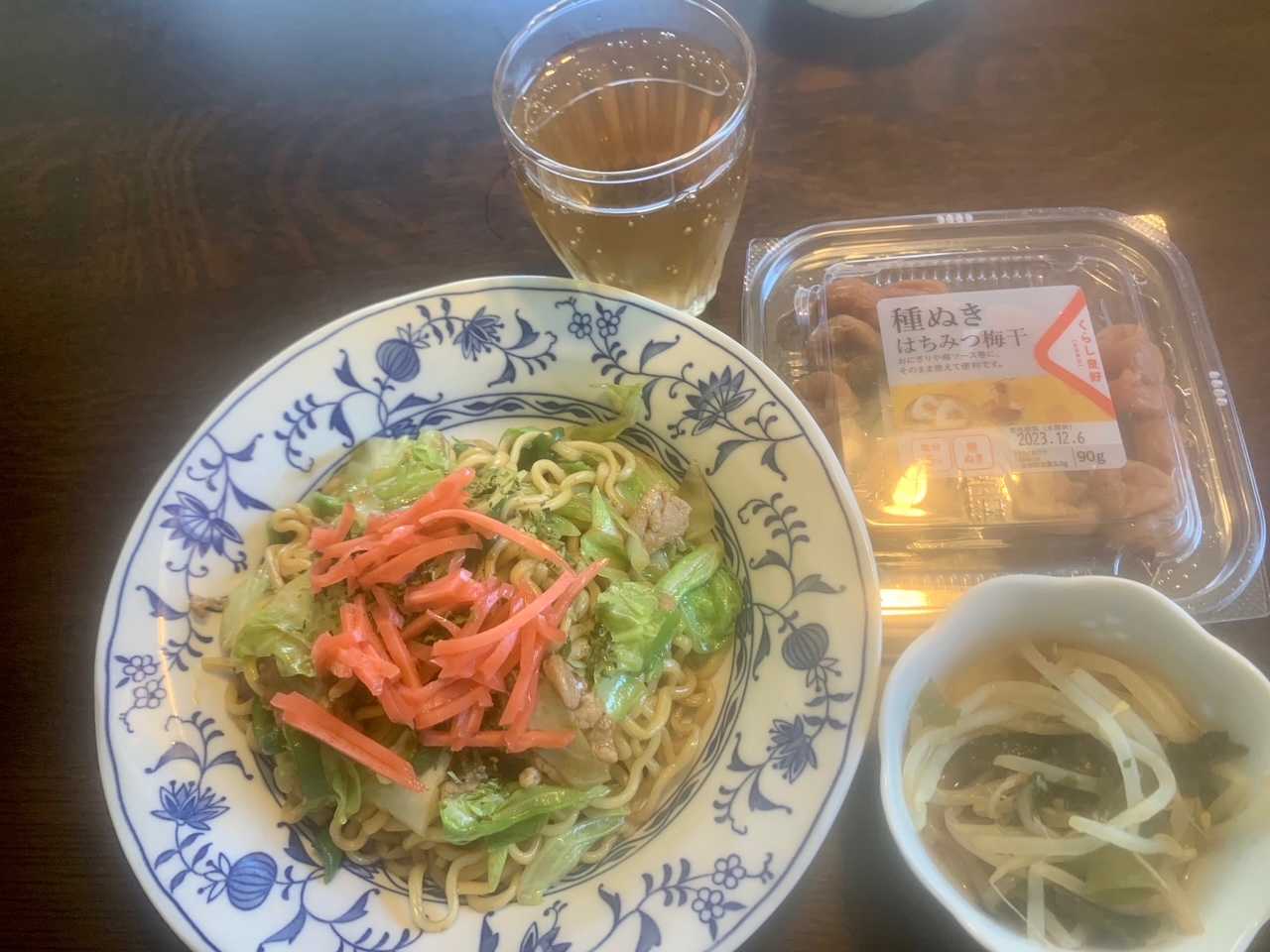 卓球の練習に行きました。昼食は、焼きそば・青のり・紅生姜、梅干し、わかめ・もやしの酢の物、麦茶。