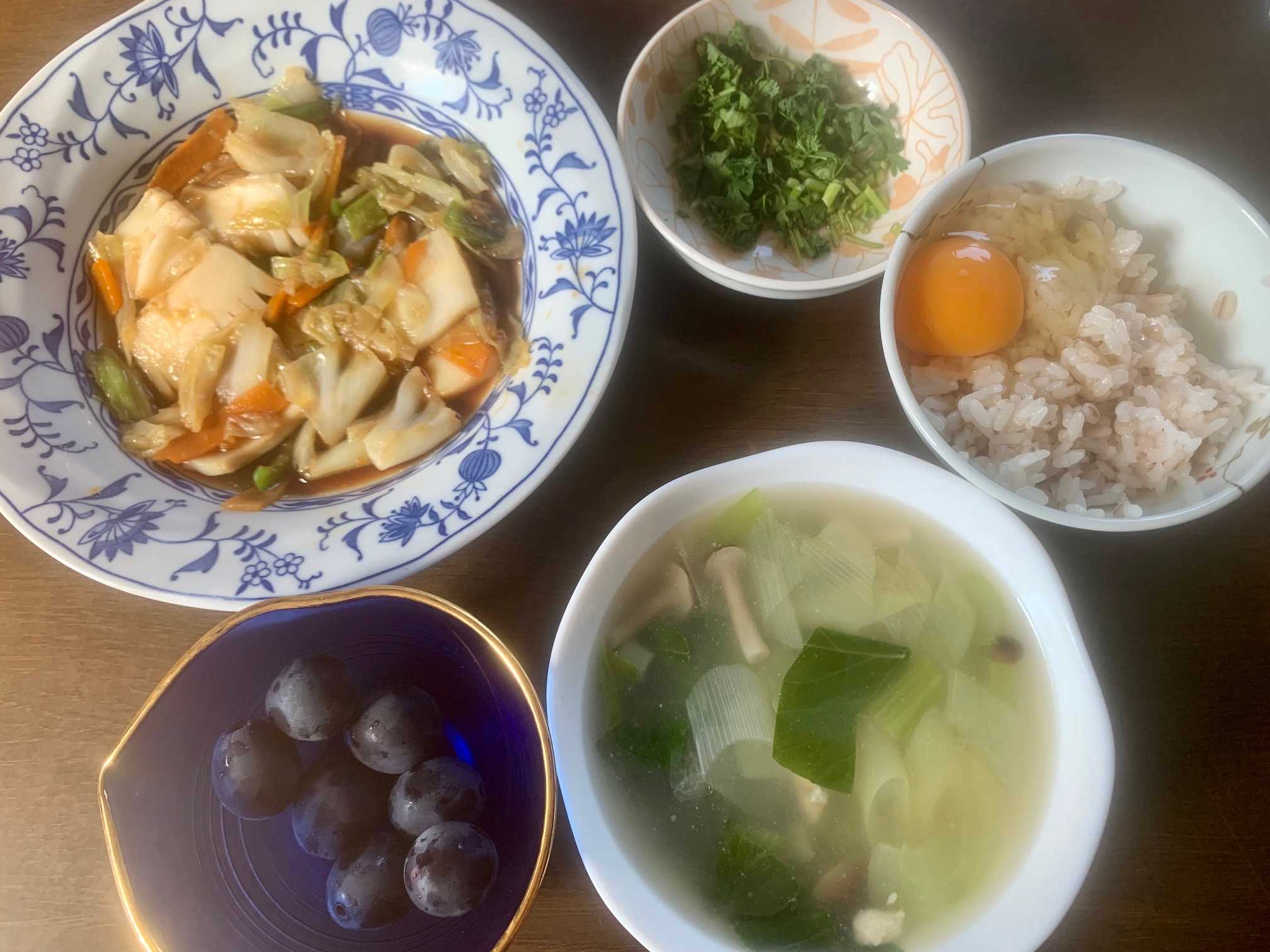 朝食は、烏賊・ピーマン・人参・キャベツ炒め、パクチーの胡麻油・めんつゆ和え、鶏・青梗菜・しめじの白湯スープ、卵かけご飯、巨峰。