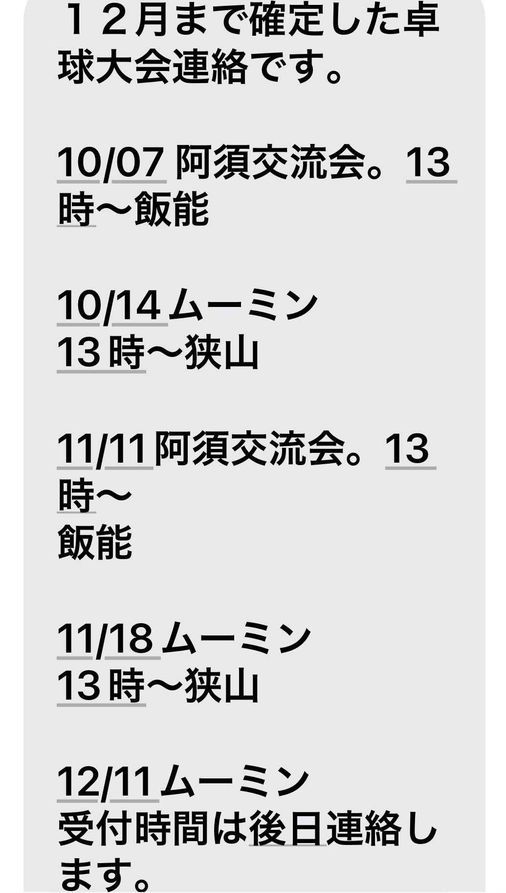 ムーミン卓球親睦会のTさんから、12月まで確定した卓球大会連絡が来ました。ダブルスペアFさんと参加。10月14日は、二人共参加できないけど、他は参加できます。返信で参加申し込みました。Tさんだけだと不安なので、スタッフのKEさんにも念の為連絡しました。