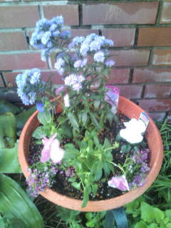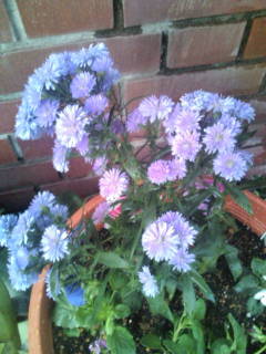 孔雀アスター、パンジー、スィートアリッサムの寄せ植え。