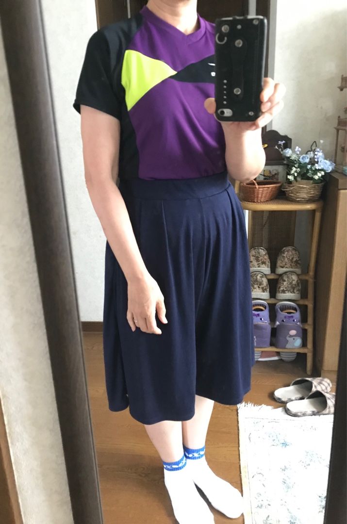 紫・黄色・黒の卓球ウェア、黒のフレアスコート、白・青の靴下、ピンクのサンダル。