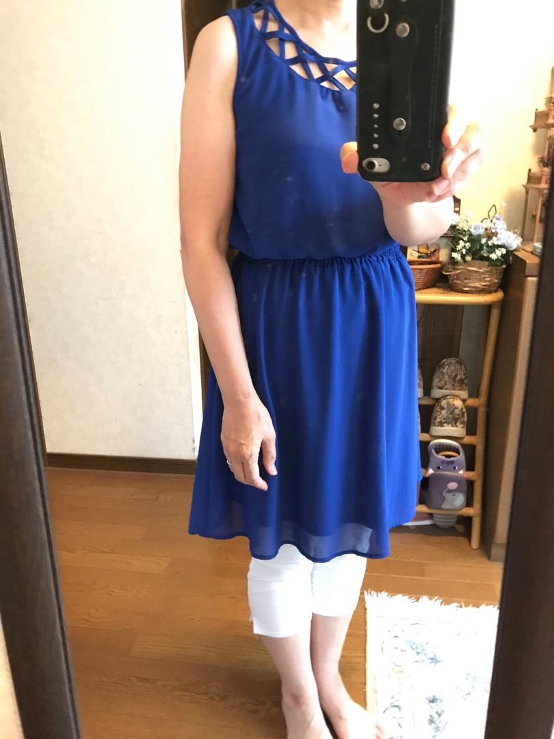 卓球・入浴後、青のカットワークのチュニック、白パンツ、ピンクのサンダル。