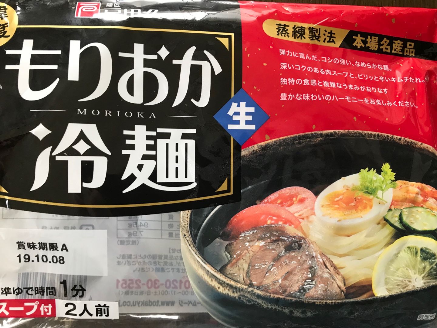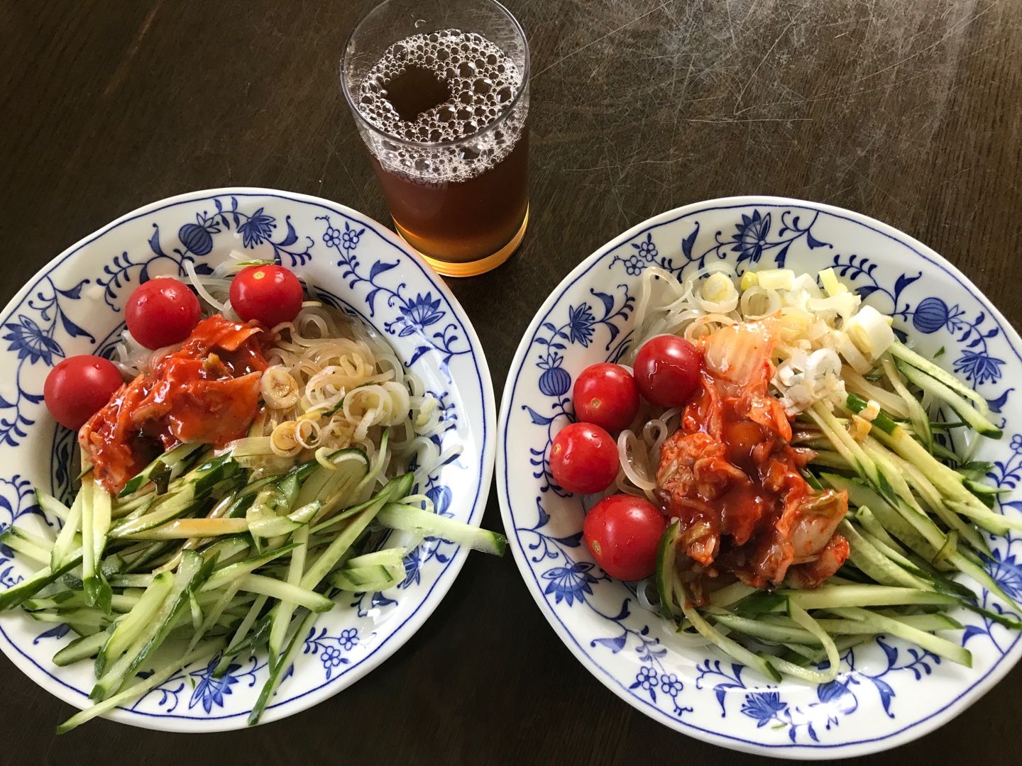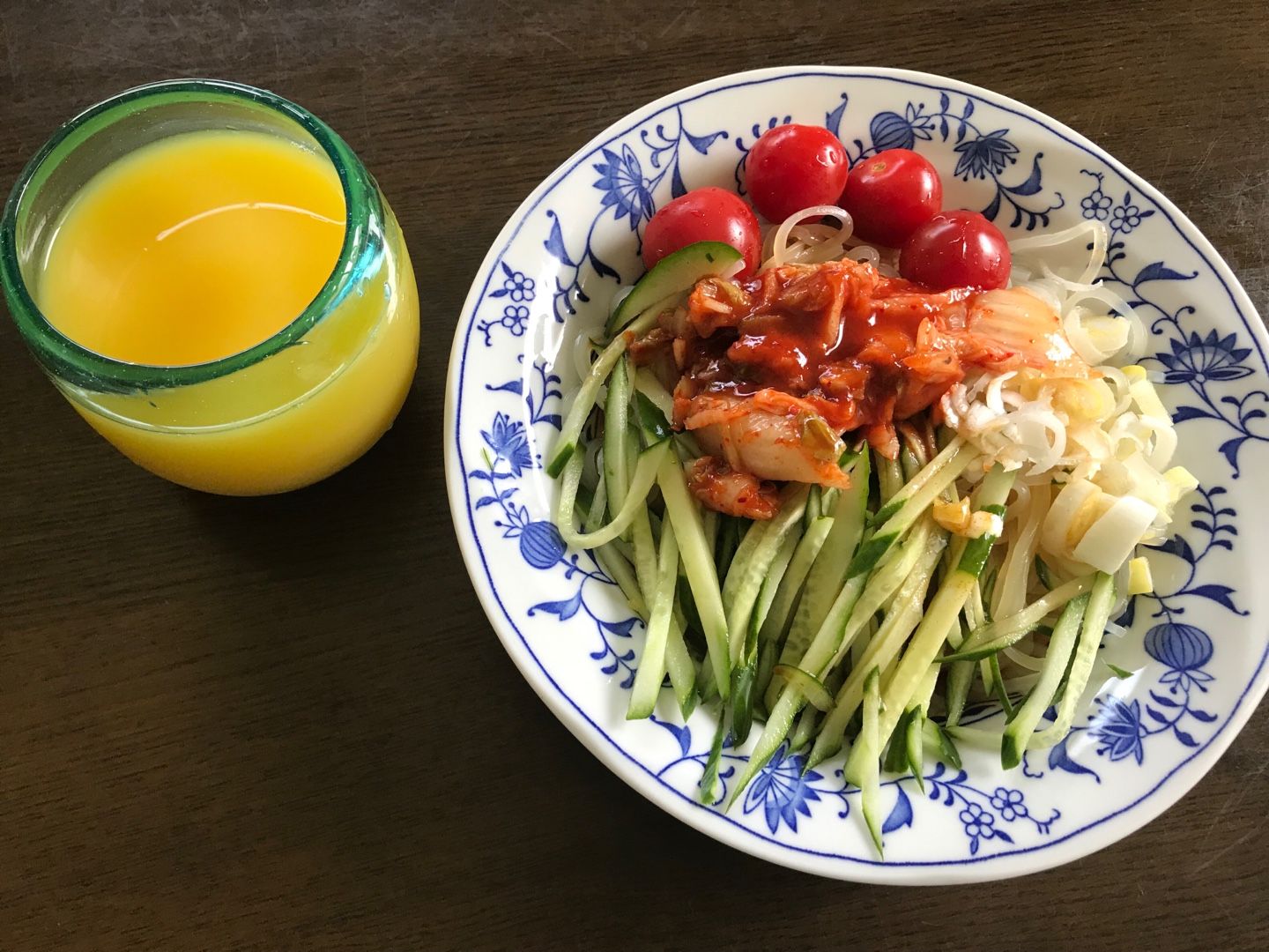 昼食は、盛岡冷麺。ミニトマト、キムチ、胡瓜、葱。