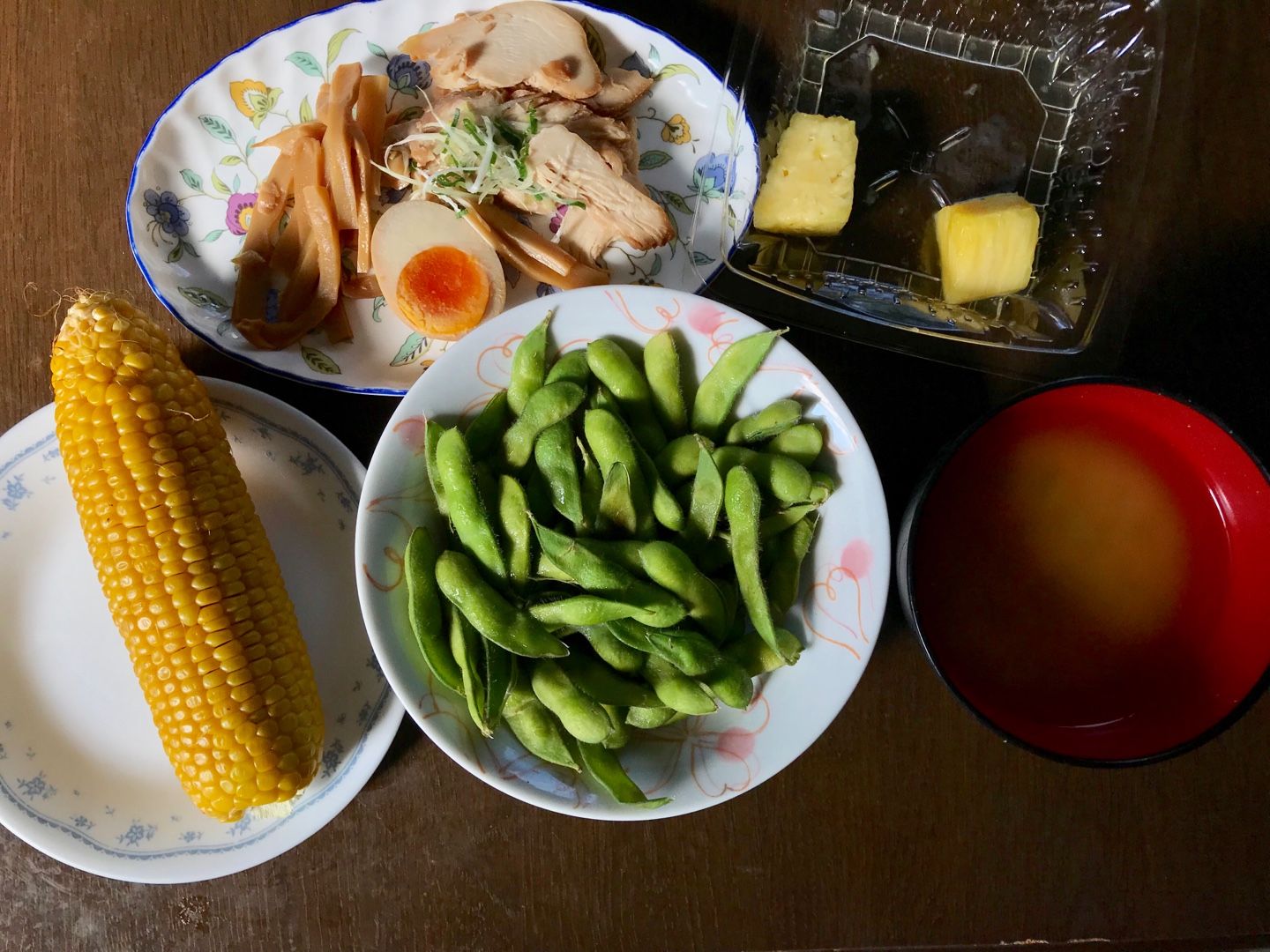 朝食は、蒸しとうもろこし、チャーシュー・メンマ・茹で卵・葱、枝豆、大根の葉の味噌汁、パイン。