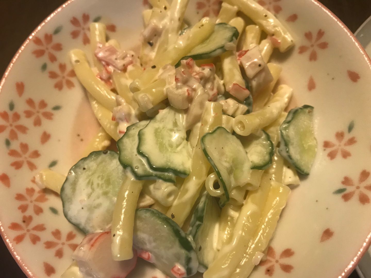 マカロニサラダ。胡瓜・かにかま。