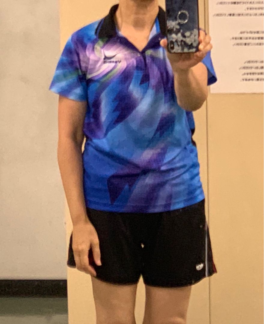 卓球には、青・紫・黒の卓球ウェア、黒・赤のハーフパンツ、白・水色の靴下、ピンクのサンダル。