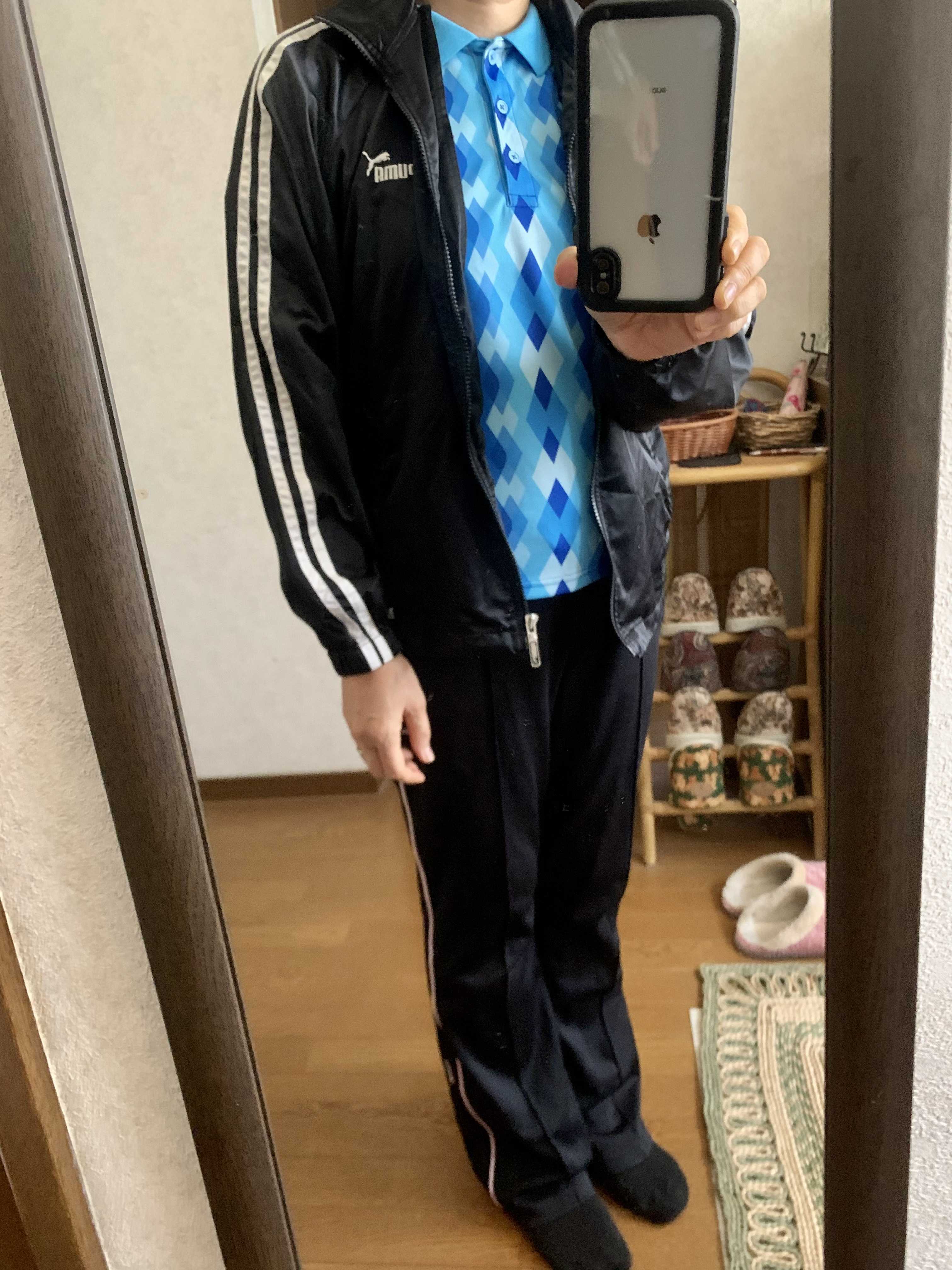 卓球には、水色・青・白の卓球ウェア、黒・白のジャージ上下、黒靴下、紺ブーツ、臙脂のライトダウン。