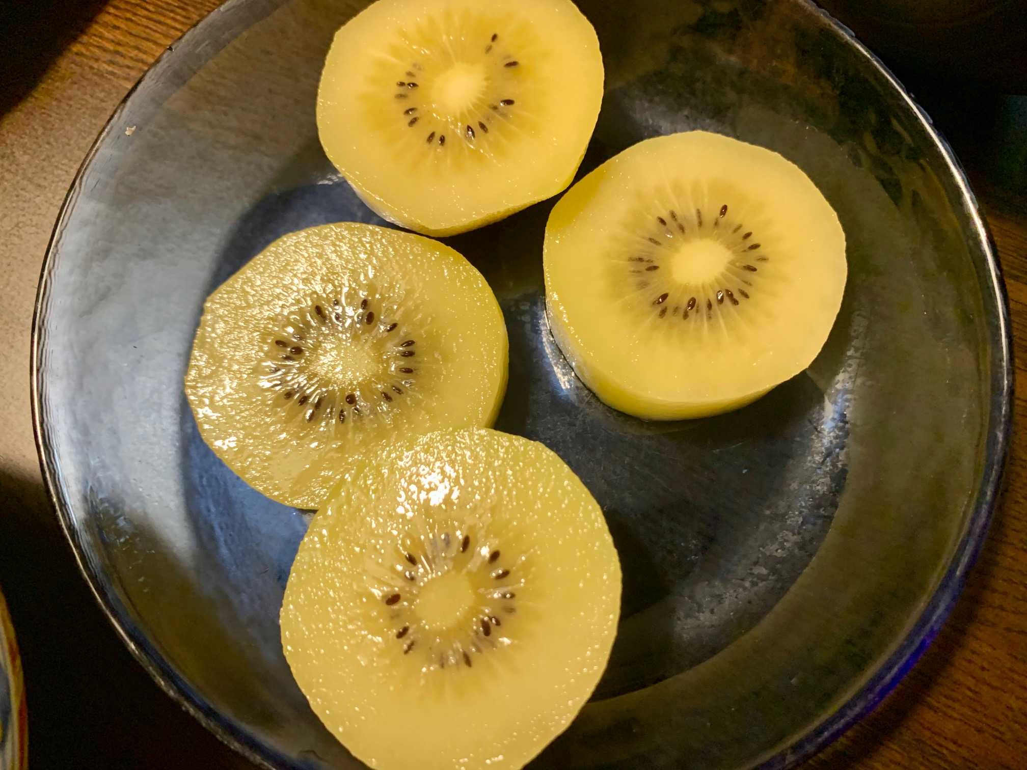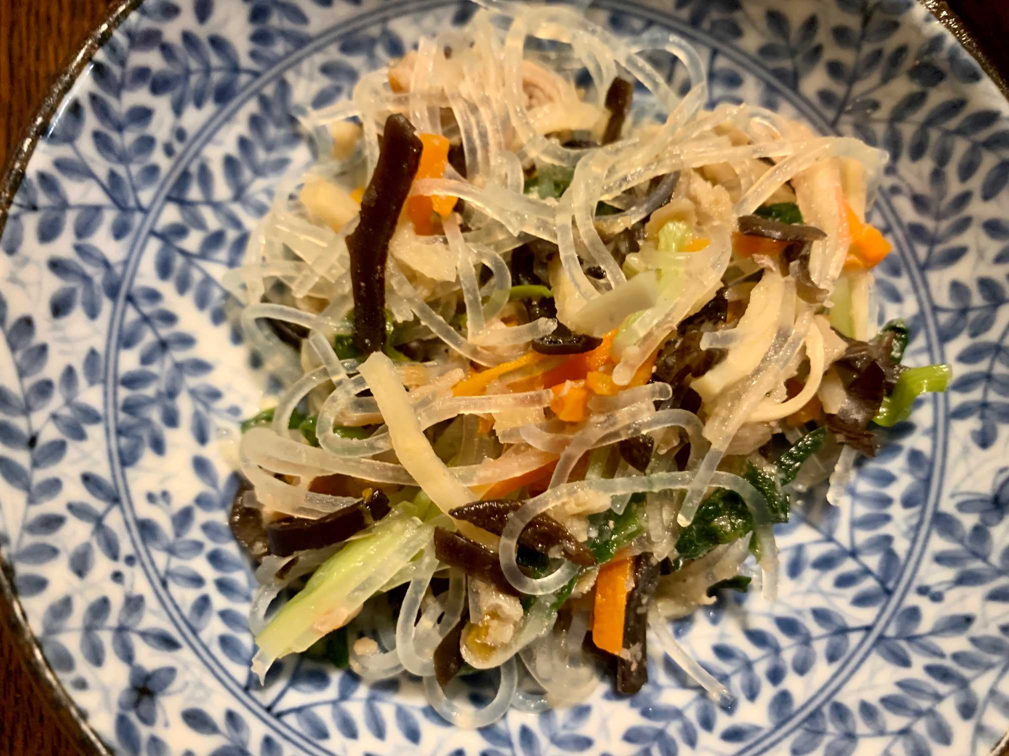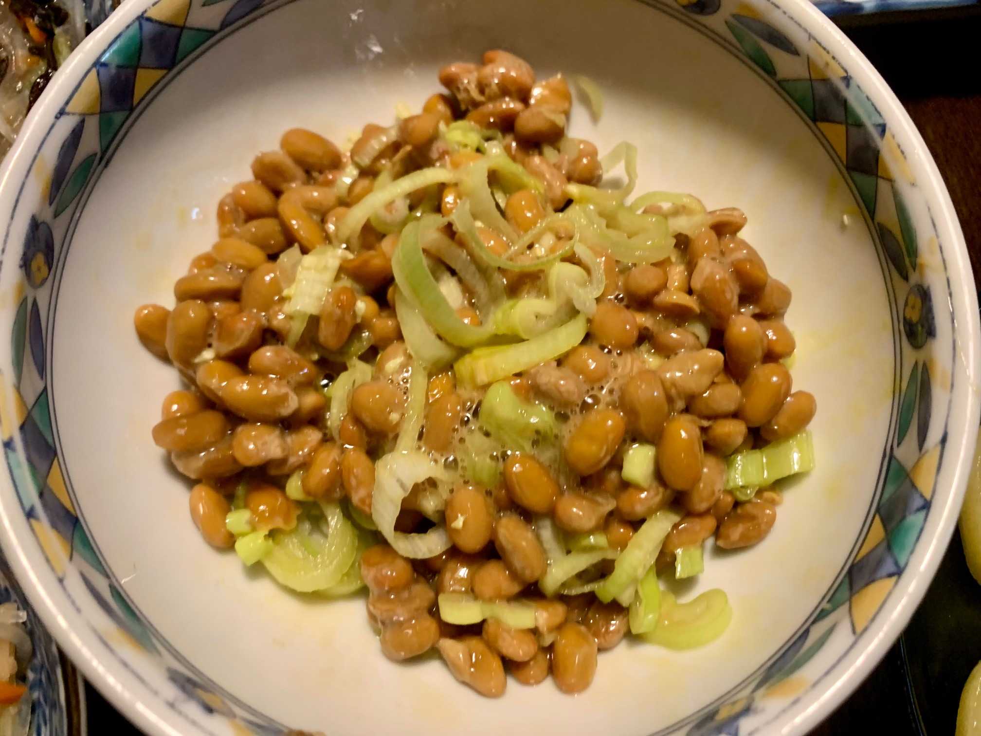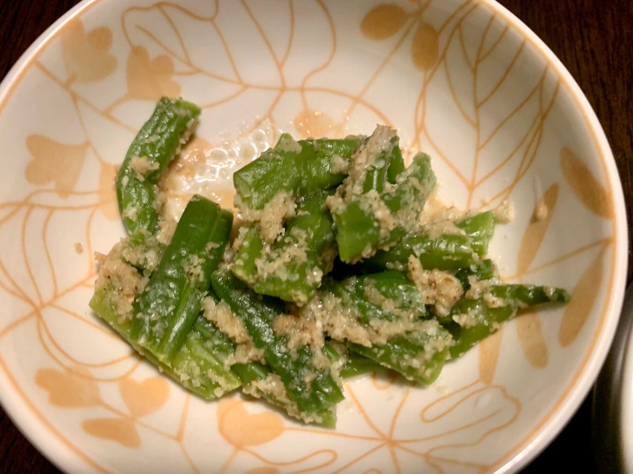 夕食は、鯖の味噌煮、納豆・ネギ、和風春雨サラダ、隠元の胡麻和え、茄子の味噌汁、ゴールドキウイ。