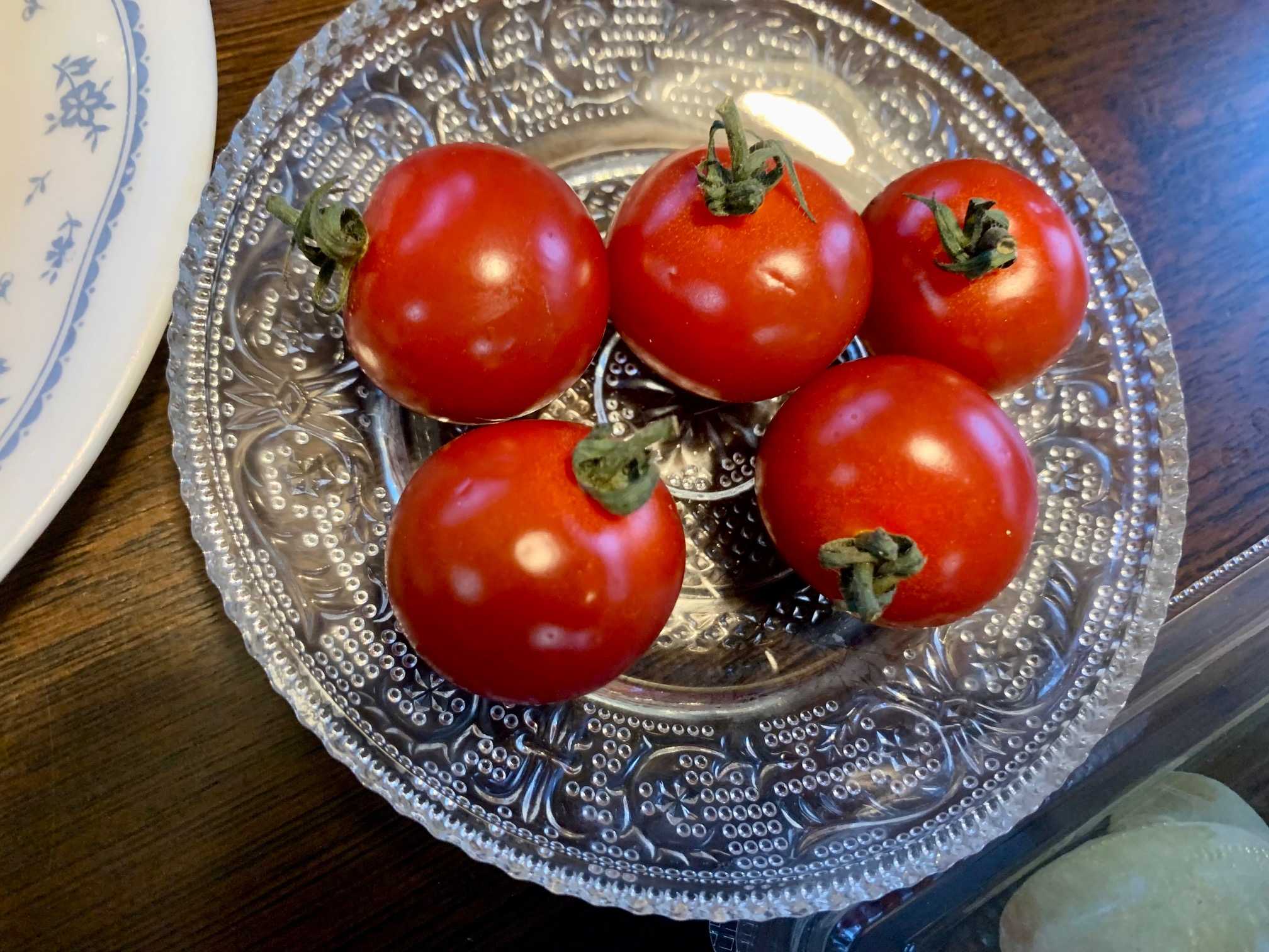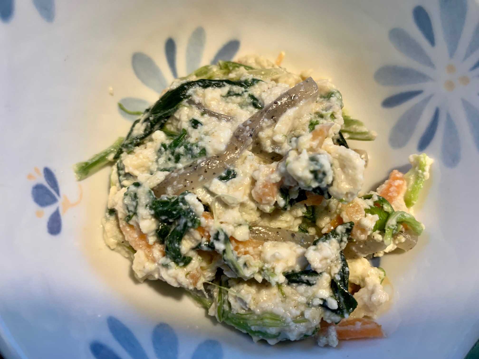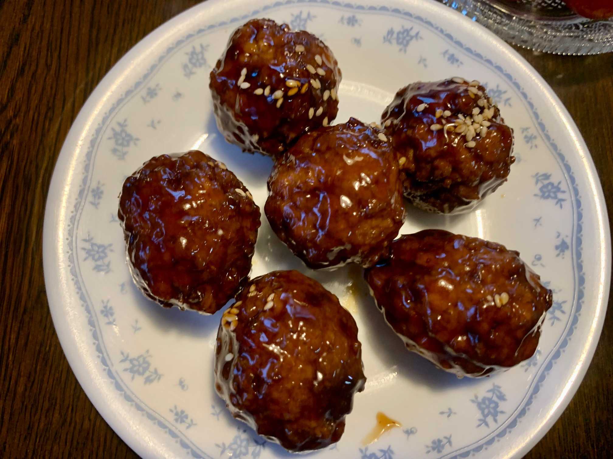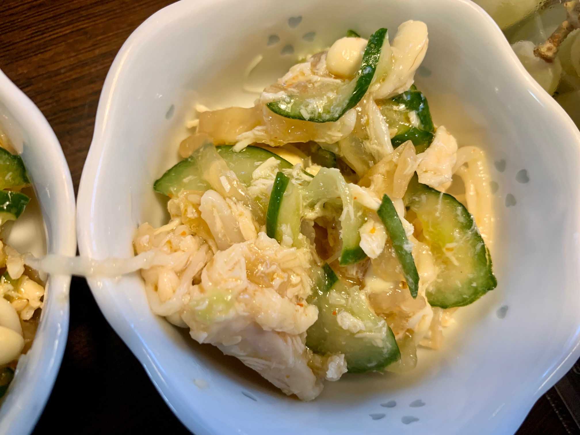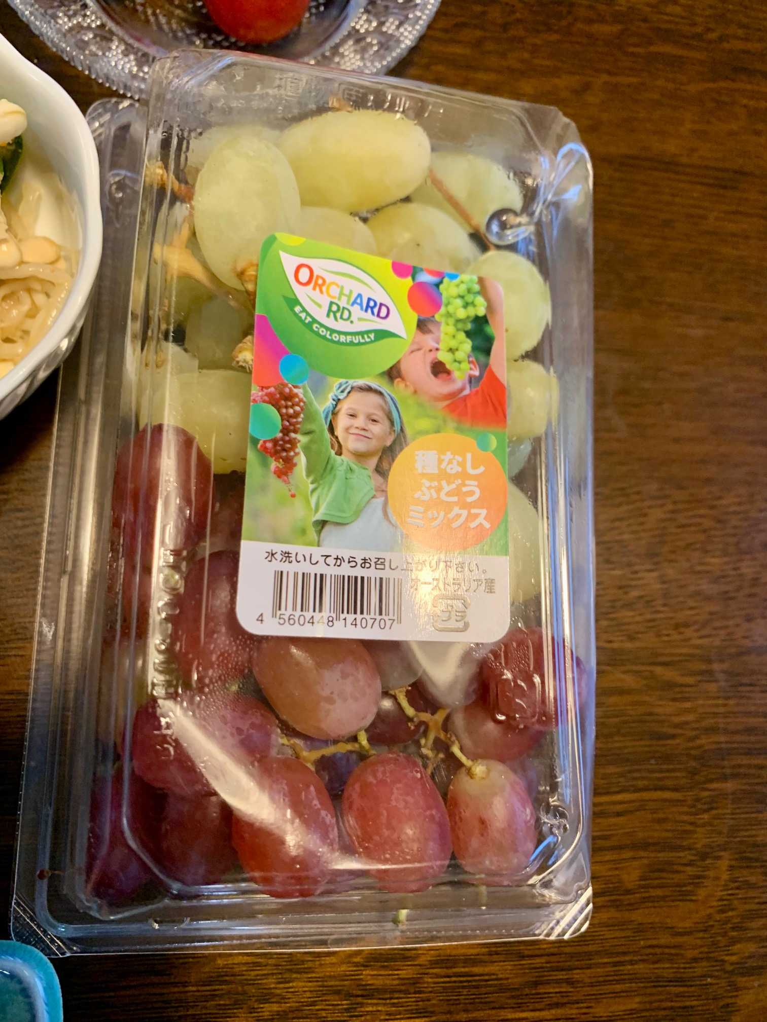 夕食は、肉団子、スモークサーモン、ミニトマト、鶏・中華クラゲ・もやし・胡瓜、ほうれん草の白和え、キャベツの味噌汁、種無しぶどうミックス。