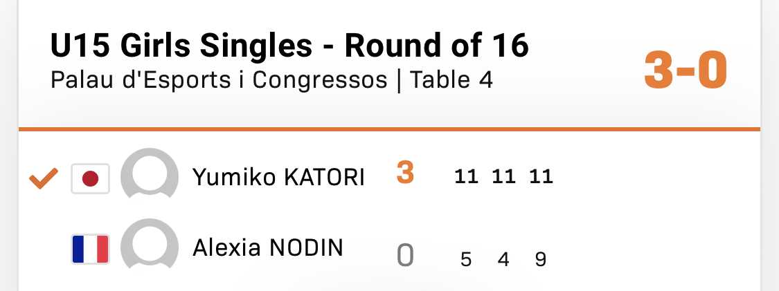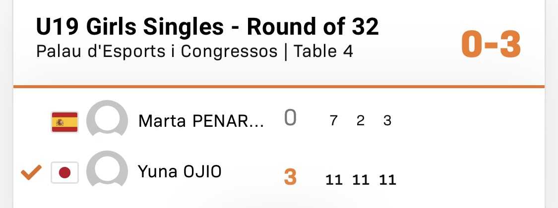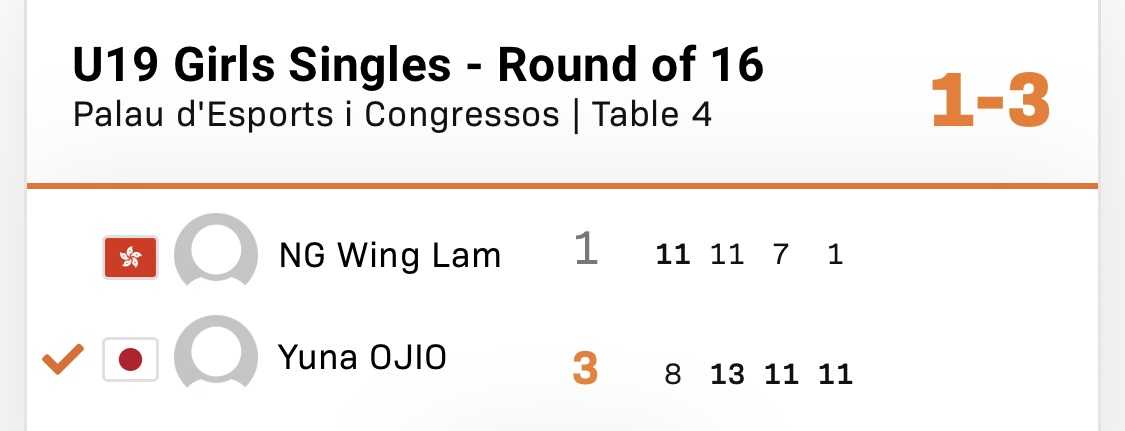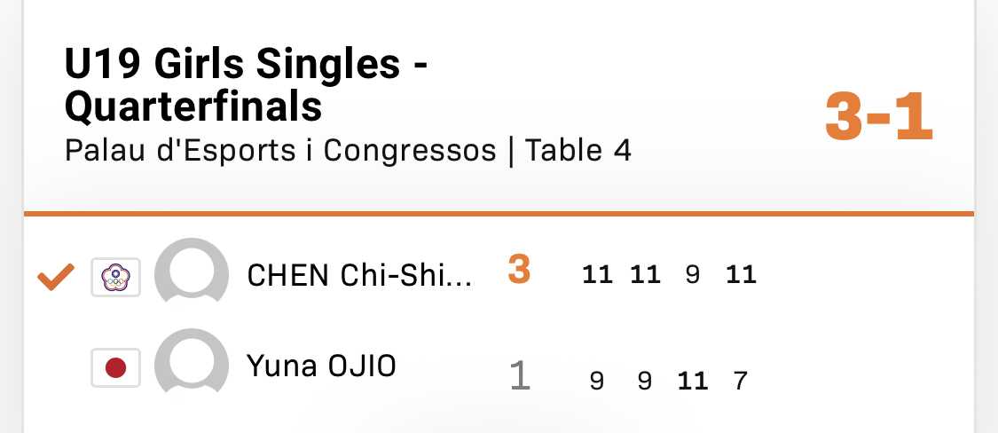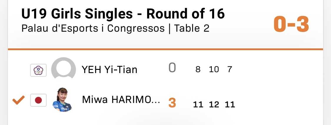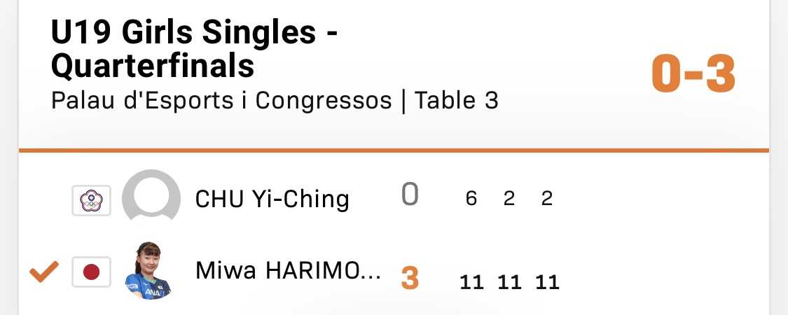 ・CHU Yi-Ching(台湾):WR 0-3 張本美和(13):WR7