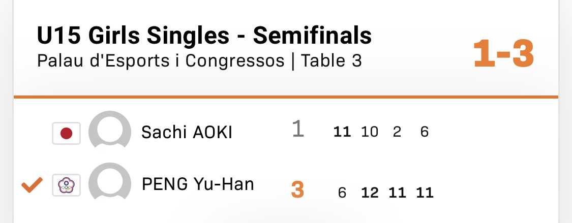 ・青木咲智(15):WR142 1-3 PENG Yu-Han(14・台湾):WR216