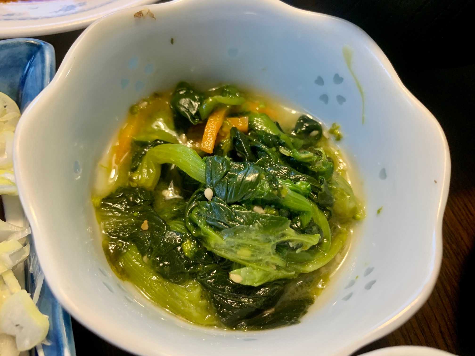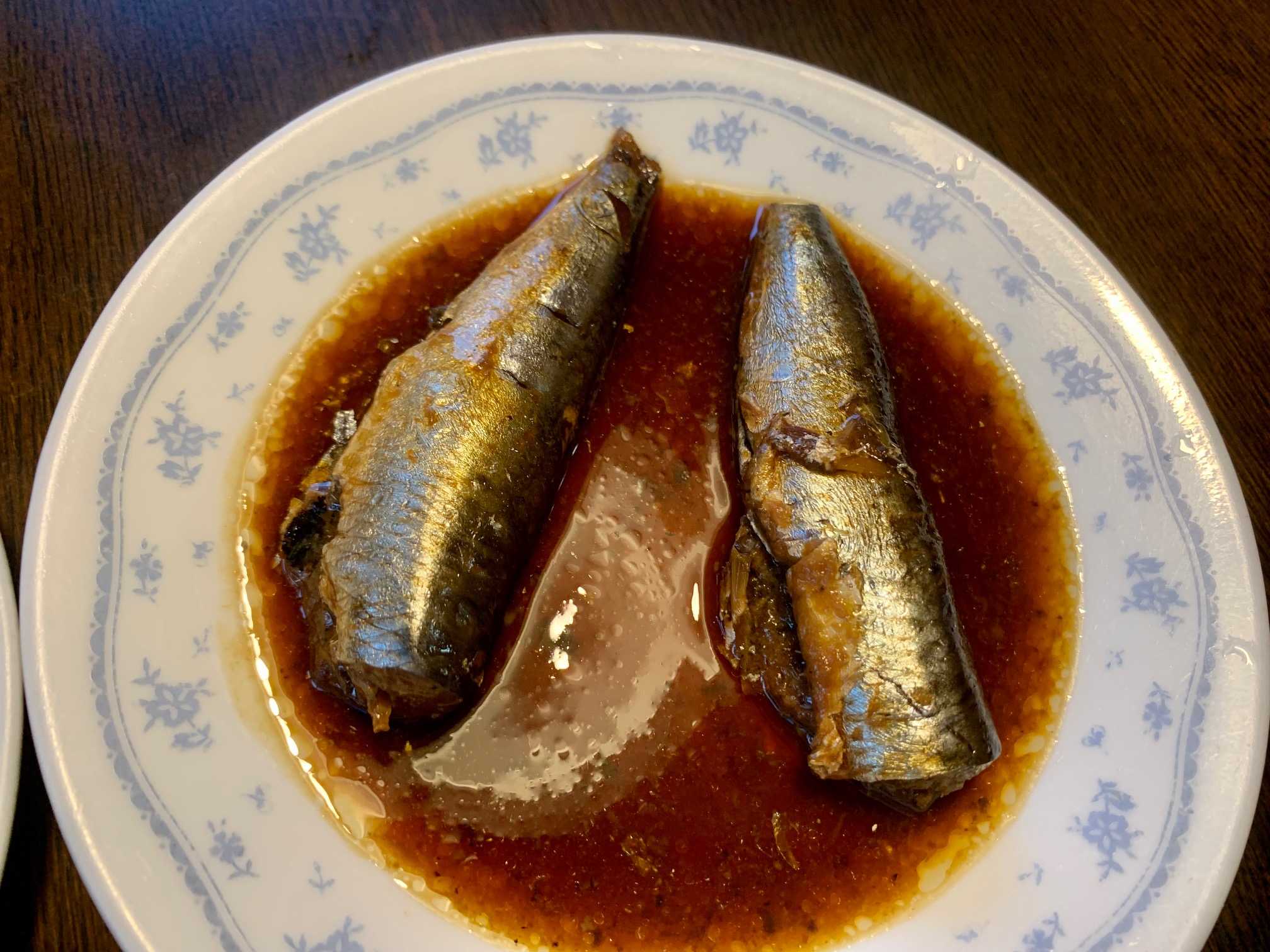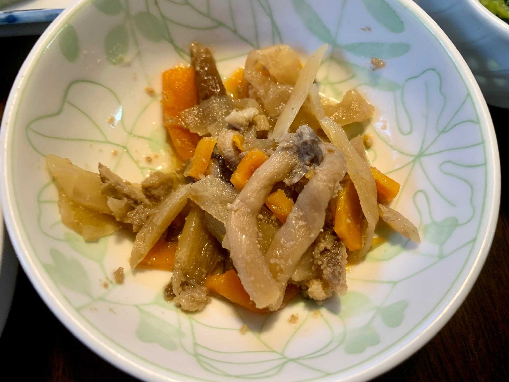夕食は、鰯の生姜煮、蒸し茄子・ネギ・生姜、菜の花・人参の辛し和え、根菜のそぼろ炒め、小松菜の味噌汁。