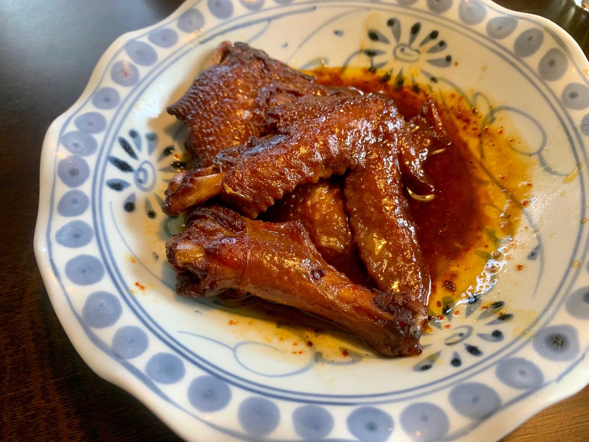昼食は、豚・卵炒め、きんぴらごぼう、梅干し、麦ご飯、麦茶。手羽先の醤油煮。