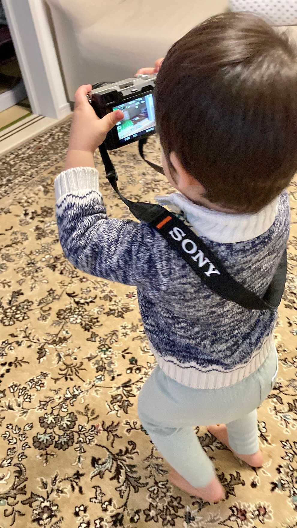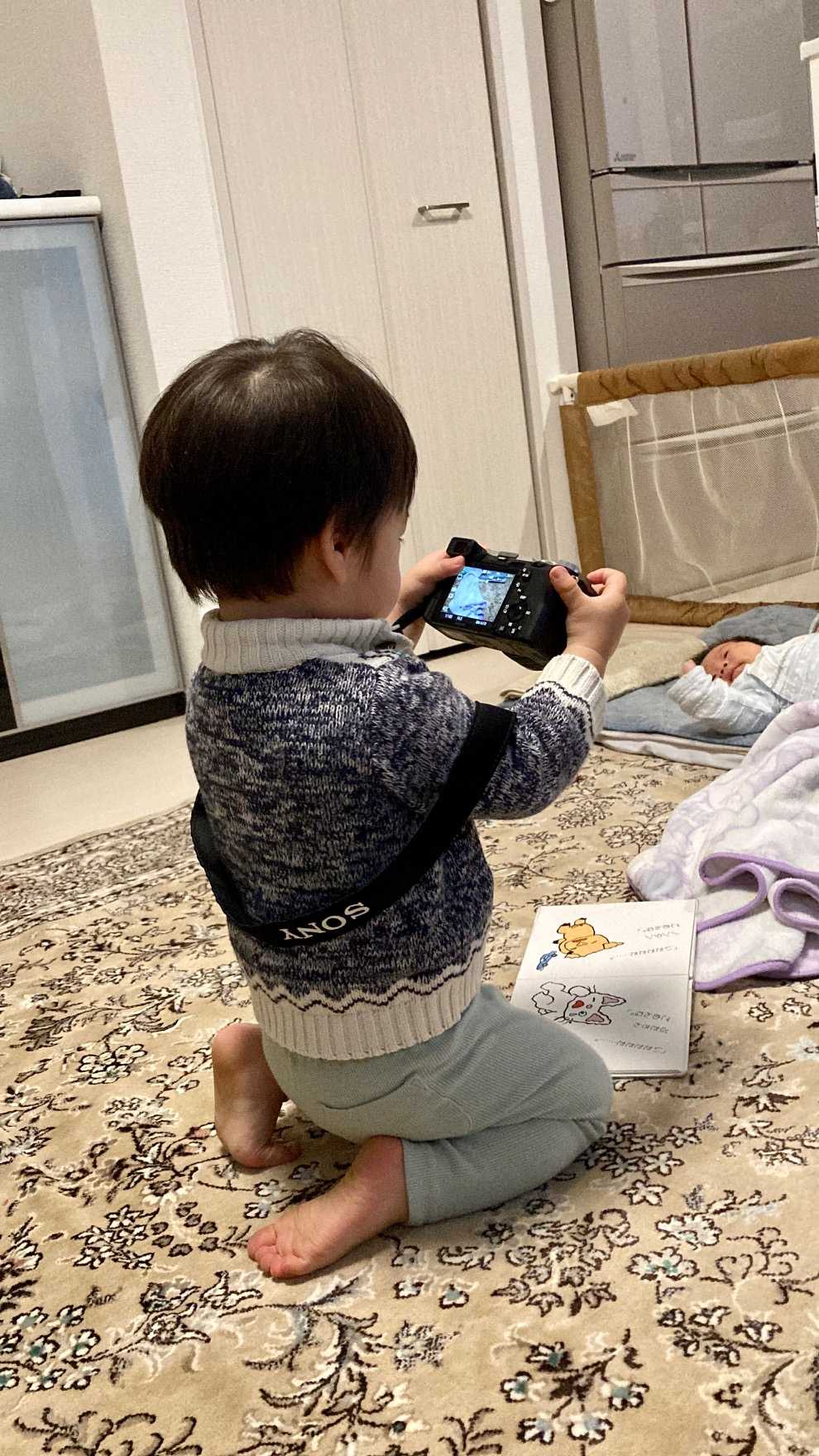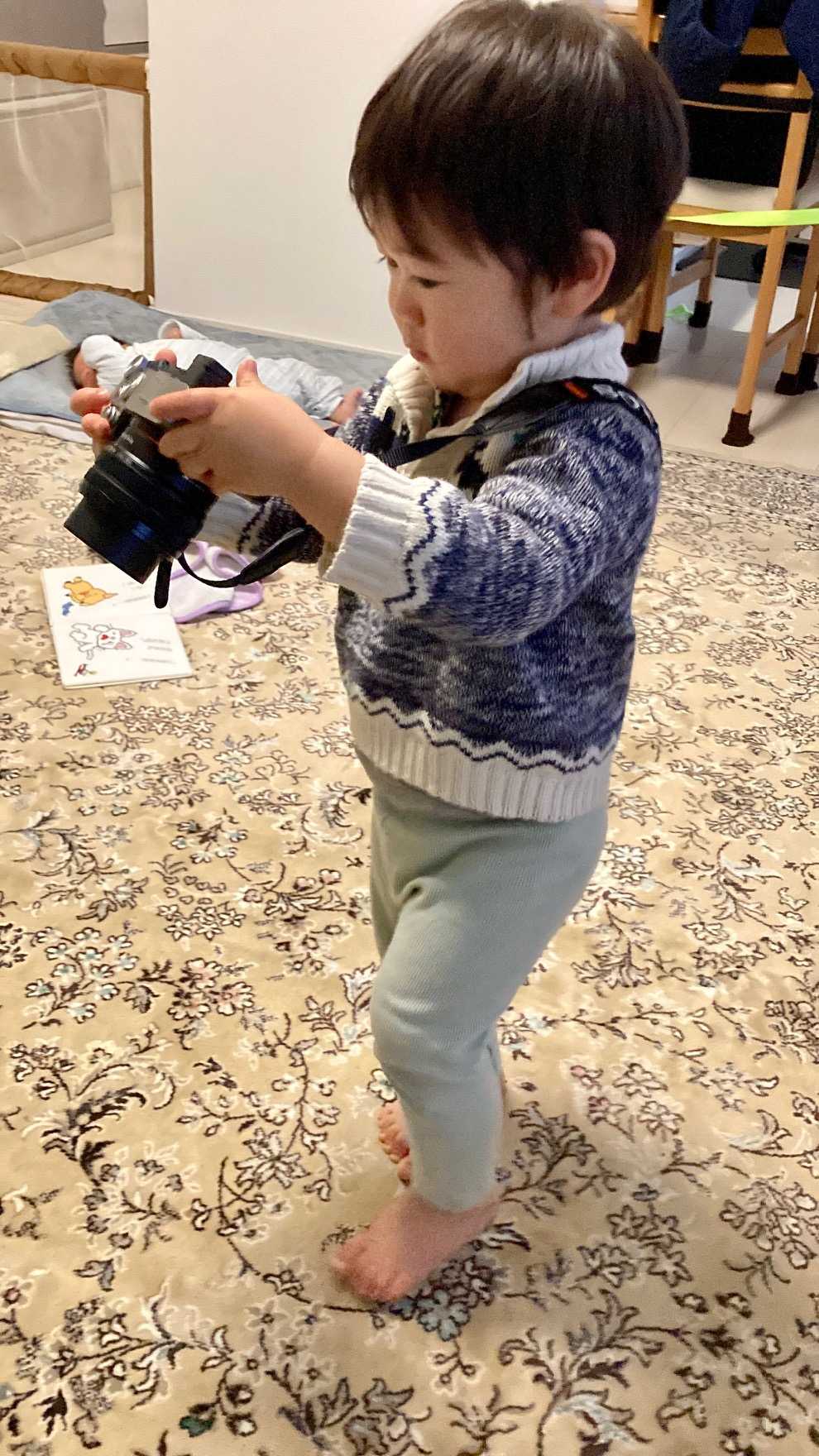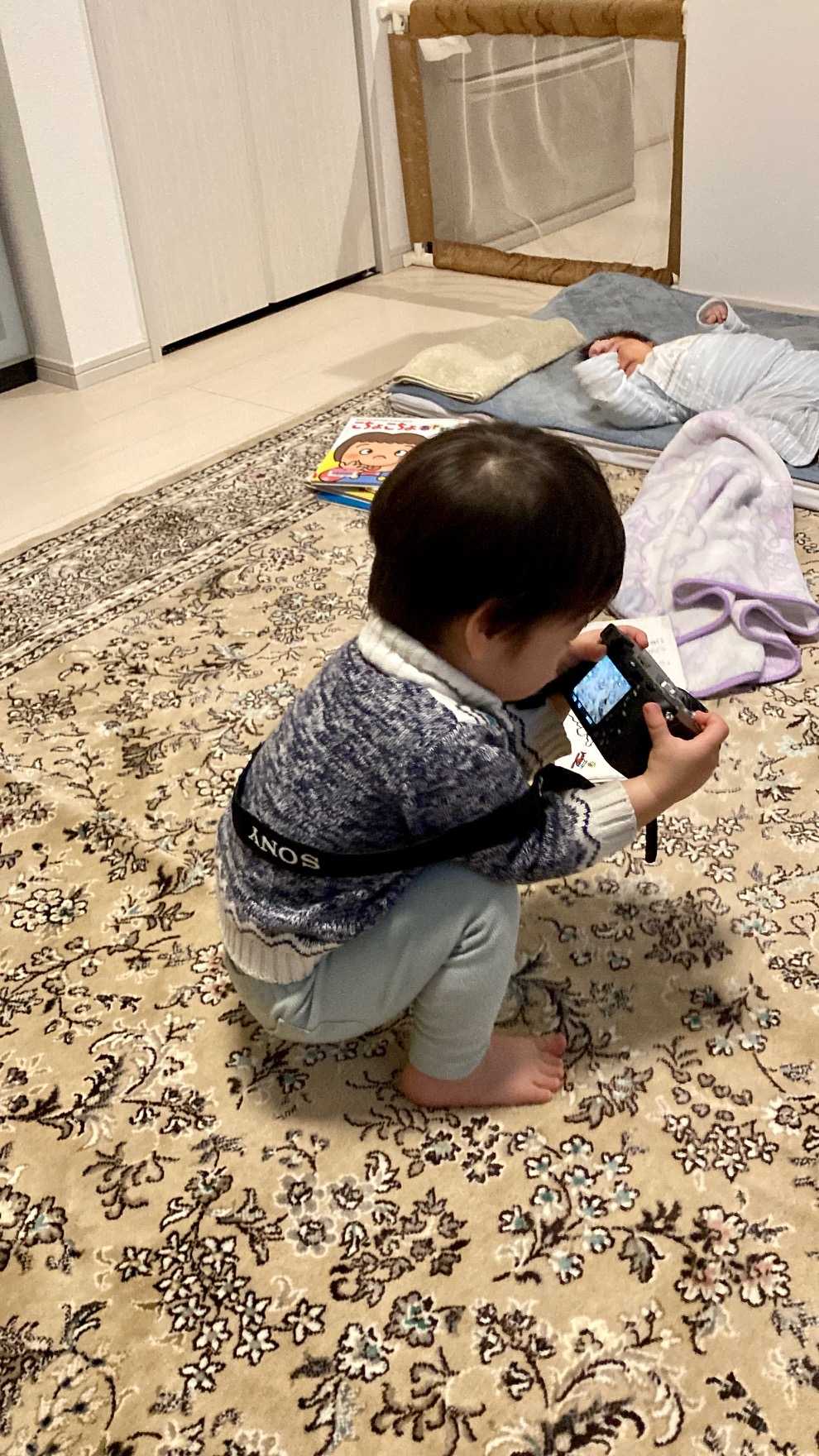 カメラが気になる兄。壊されちゃうと思って渡したくなかったのですが、少しだけチャレンジしてみました。