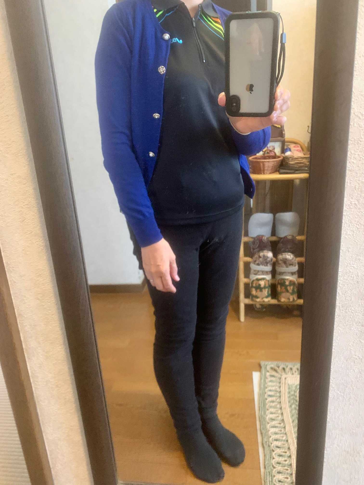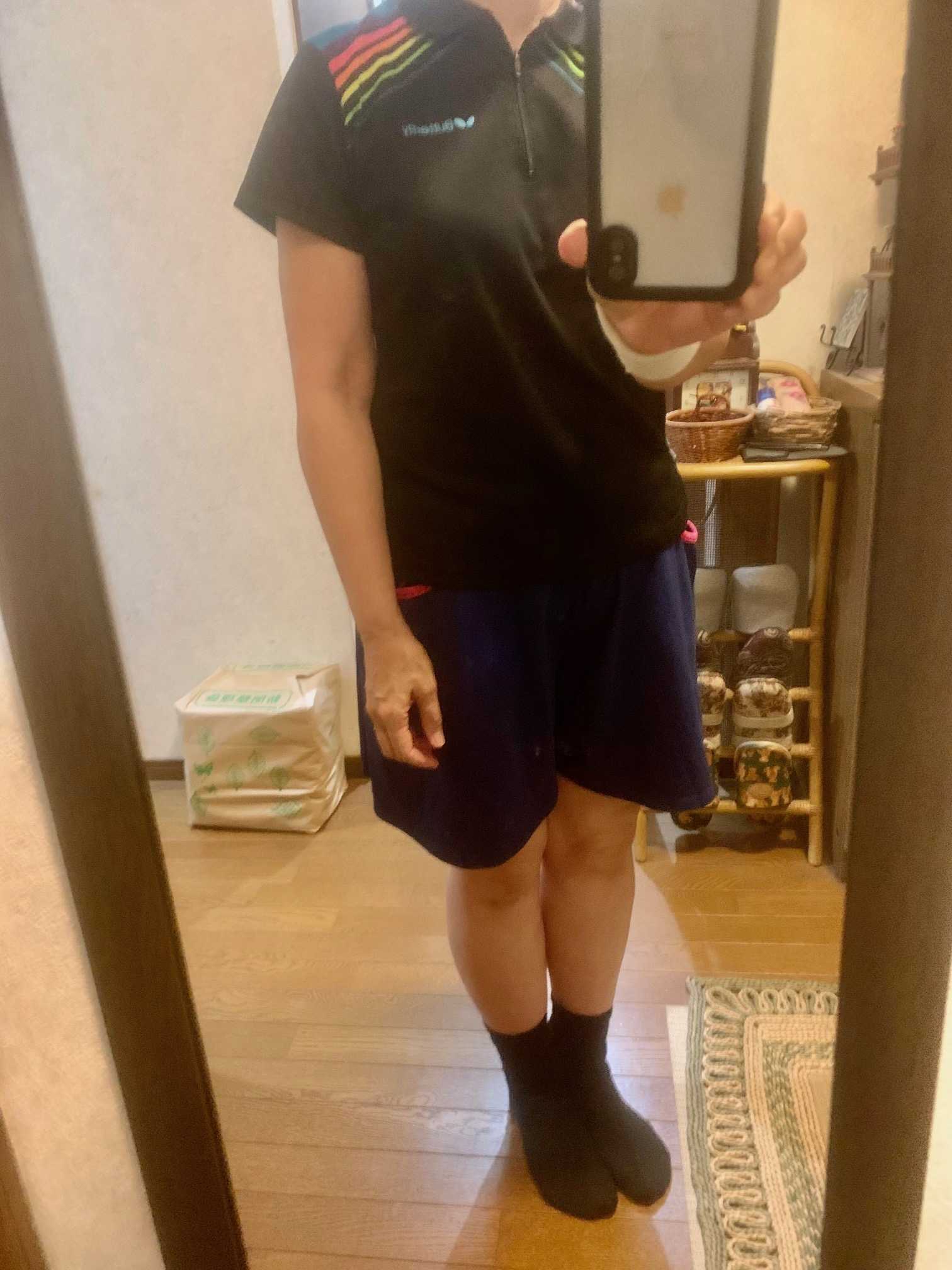 卓球には、黒・レインボーの卓球ユニフォーム、紺・ピンクの卓球キュロット、黒靴下、青のストレッチシューズ。