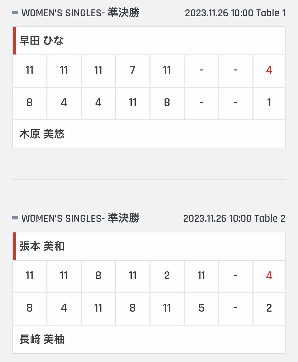 | 張本美和 | 11 | 11 | 8 | 11 | 2 | 11 | * | 4 |