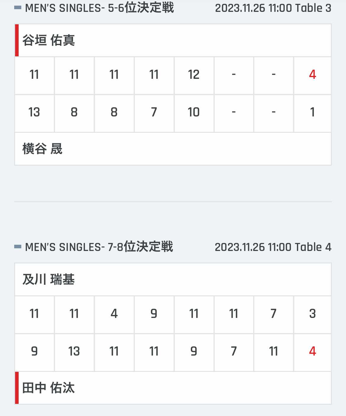 ・及川瑞基 3- 4 田中佑汰 (11-9,11-13,4-11,9-11,11-9,11-7,7-11)